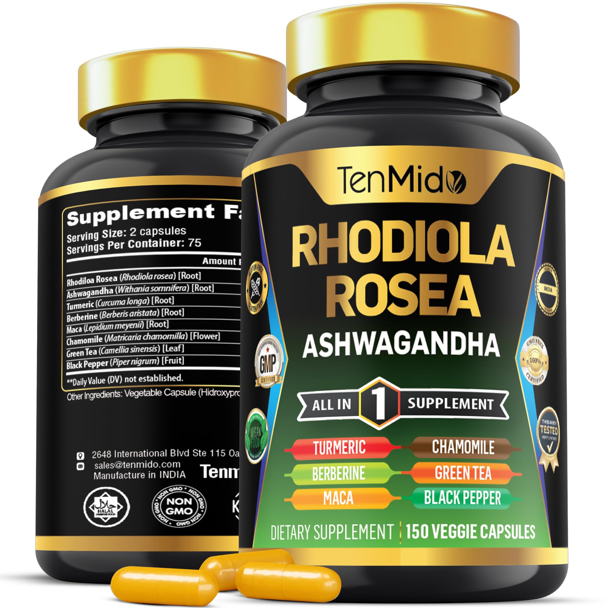 ? At Tenmido, we are dedicated to supporting your health. Our mission is to provide you with an optimized solution and we guarantee product quality because we believe your well-being is paramount. Experience the difference today and discover the power of our herb supplements! If, for any reason, you are unsatisfied with your order, please contact us immediately to get it resolved. You can rest assured that you can use our products, as your satisfaction and health are our top priorities. ? Our Rhodiola extract supplement undergoes rigorous third-party lab testing to ensure purity. It is manufactured in an FDA-registered facility that follows GMP, Kosher, and Halal standards, guaranteeing non-GMO, gluten-free, and vegetarian-friendly products. We test each batch both ourselves and through a third-party independent laboratory to ensure that your Tenmido product contains the correct standardized level of purity and active ingredients. ? Convenient Nutraceuticals: Tenmido supplement offers an abundance of benefits. Our all-in-one capsules have been packed into one convenient solution that is quick and easy to take. Clear out those clutter of numerous supplements in your cabinet, and make room for a single solution from Tenmido. The Rhodiola rosea capsules are multimineral and provide a great alternative to other single mineral capsules. One bottle contains 150 veggie capsules for 75 days supply. ? Superior Extracts for Enhanced Benefits: Our Rhodiola supplements are formulated to be more effective than regular Rhodiola Rosea, ensuring maximum absorption and potency. Each serving delivers 550 mg of Rhodiola Rosea extract 20:1, 150 mg of Ashwagandha extract 20:1, 100 mg of Turmeric extract 15:1, 80 mg of Berberine extract 15:1, 50 mg of Maca extract 15:1, 30 mg of Chamomile extract 10:1, 30 mg of Green Tea extract 10:1 and more, guaranteeing superior quality and potency. ? Advanced Formula: Our Rhodiola Rosea supplement delivers a comprehensive combination of Rhodiola Rosea, Ashwagandha, Turmeric, Berberine, Maca, Chamomile, Green Tea, and Black Pepper extract for Women and Men. Tenmido has developed a potent all-in-one supplement, enriched with 8 potent ingredients. This concentrated Rhodiola supplement offers a rich blend of nutrients, provides comprehensive reinforcement for overall wellness.
