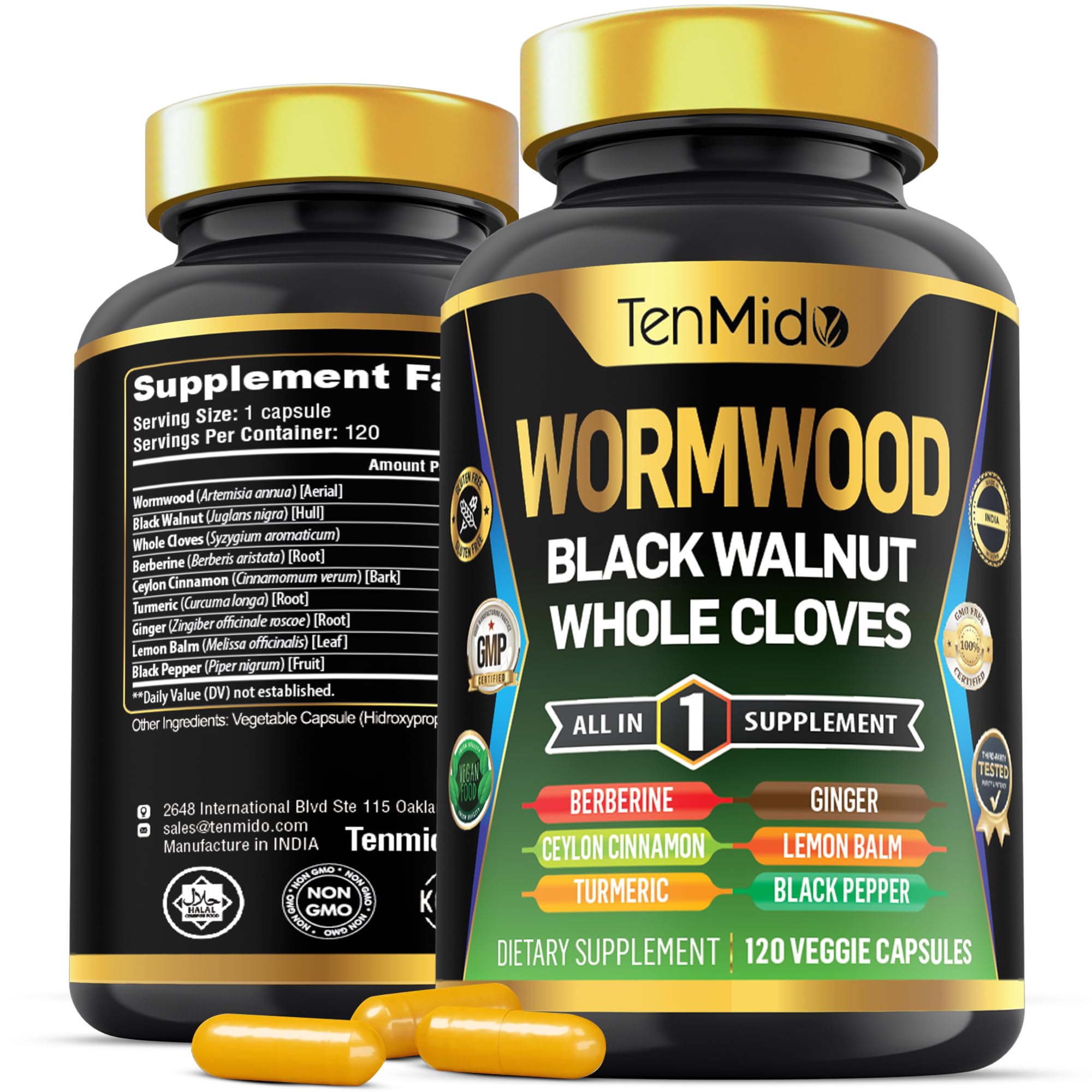 Tenmido Wormwood Black Walnut Clove Capsules - 9in1 Wormwood Extract Formula with Berberine Ceylon Cinnamon Turmeric Ginger & More - Vegan Non-GMO - 120 Capsules
