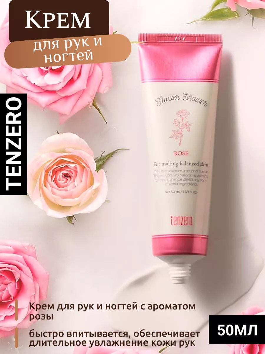 TENZERO Flower Shower Hand & Nail Cream Rose, 50ml Крем корейский для рук и ногтей с ароматом розы, 50мл. Его легкая текстура быстро впитывается, не оставляя жирной пленки, придавая вашим рукам и ногтям ощущение нежности и комфорта.