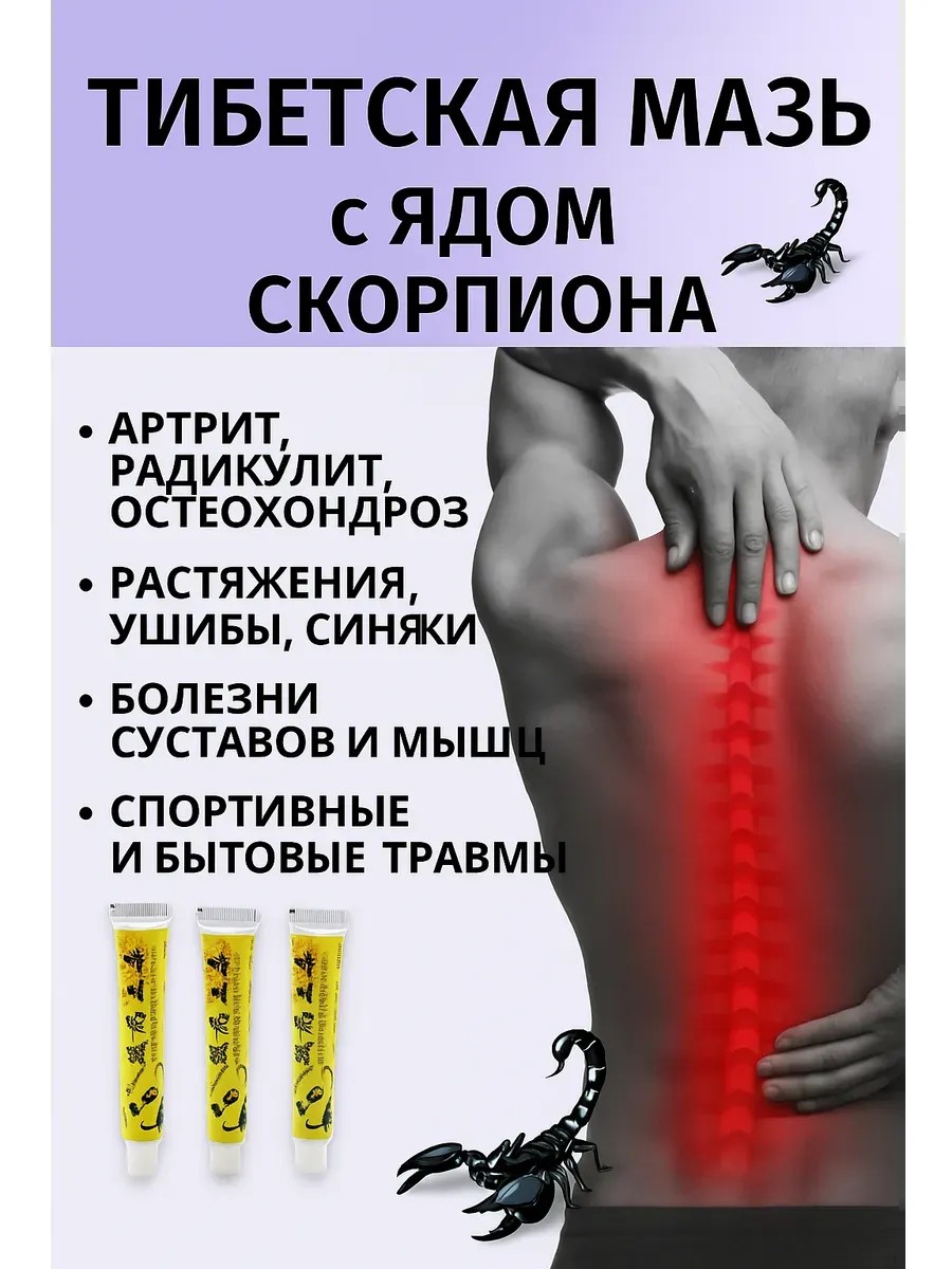 Эффективная обезболивающая мазь с ядом чёрного скорпиона и тибетскими травами. Облегчает боль, снимает воспаление и отёчность, восстанавливает подвижность суставов. Подходит для взрослых и пожилых, для применения в домашних условиях и после нагрузок.