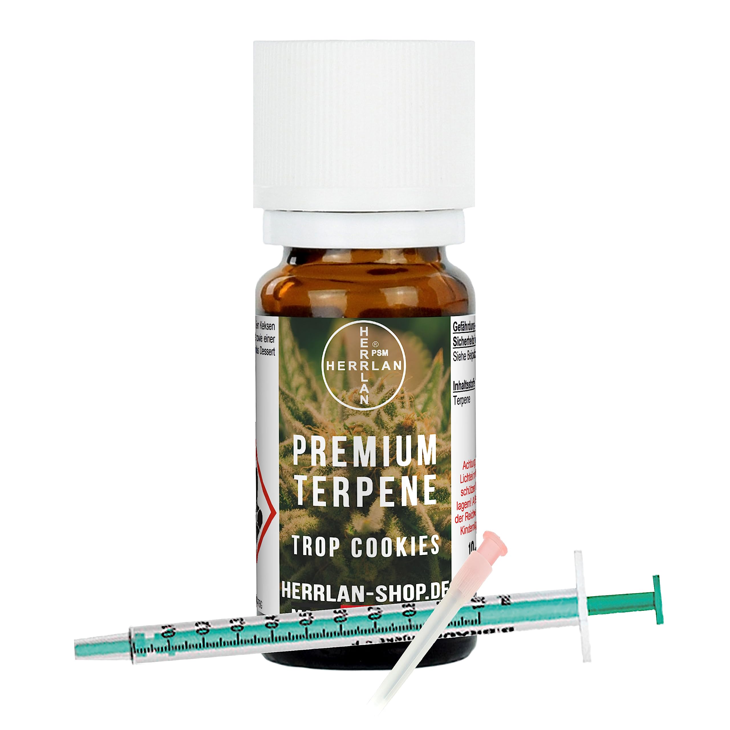 This product is not intended for use in e-cigarettes.A reimbursement can be requested for returns, but in the event of defects or damage.Our terpenes correspond to the European aroma regulation, are CLP-compliant, free of preservatives, dyes and natural origin.Highest pharmaceutical quality level!.Herrlan Premium Terpene - Pure Terpen Isolate for use as a fragrance or flavoring of food.Taste: Trop cookies is a mixture of sweet cookies and the juicy sweet fresh oranges and a fine acidity of lemons.Ideal if the dessert can be freshly fresh.Ingredients: natural terpenes.MHD: 12 months.Food certification: glass bottle brown, KSV-OV, plus syringe.