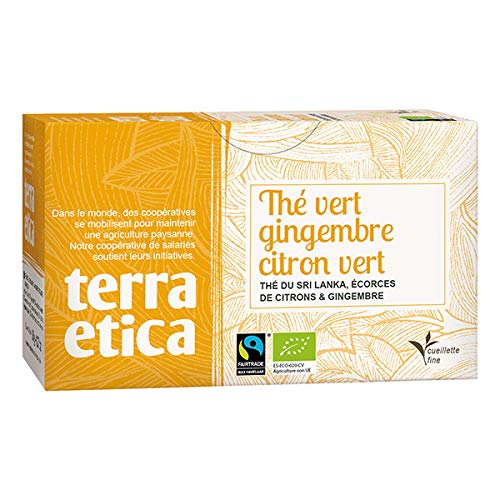 Fair trade and organic green tea with ginger and lime, box of 20 tea bags.Green Tea with Ginger and Lime. Terra Etica. Flavored green tea. Organic teas. Beverage.Thé vert au gingembre et au citron vert issu du commerce équitable et de l'agriculture biologique, boite de 20 sachets.Thé Vert Gingembre Citron Vert. Terra Etica. Thé vert parfumé. Thés bio. Boisson.Terra Etica - Thé Vert Gingembre Citron Vert - Unité