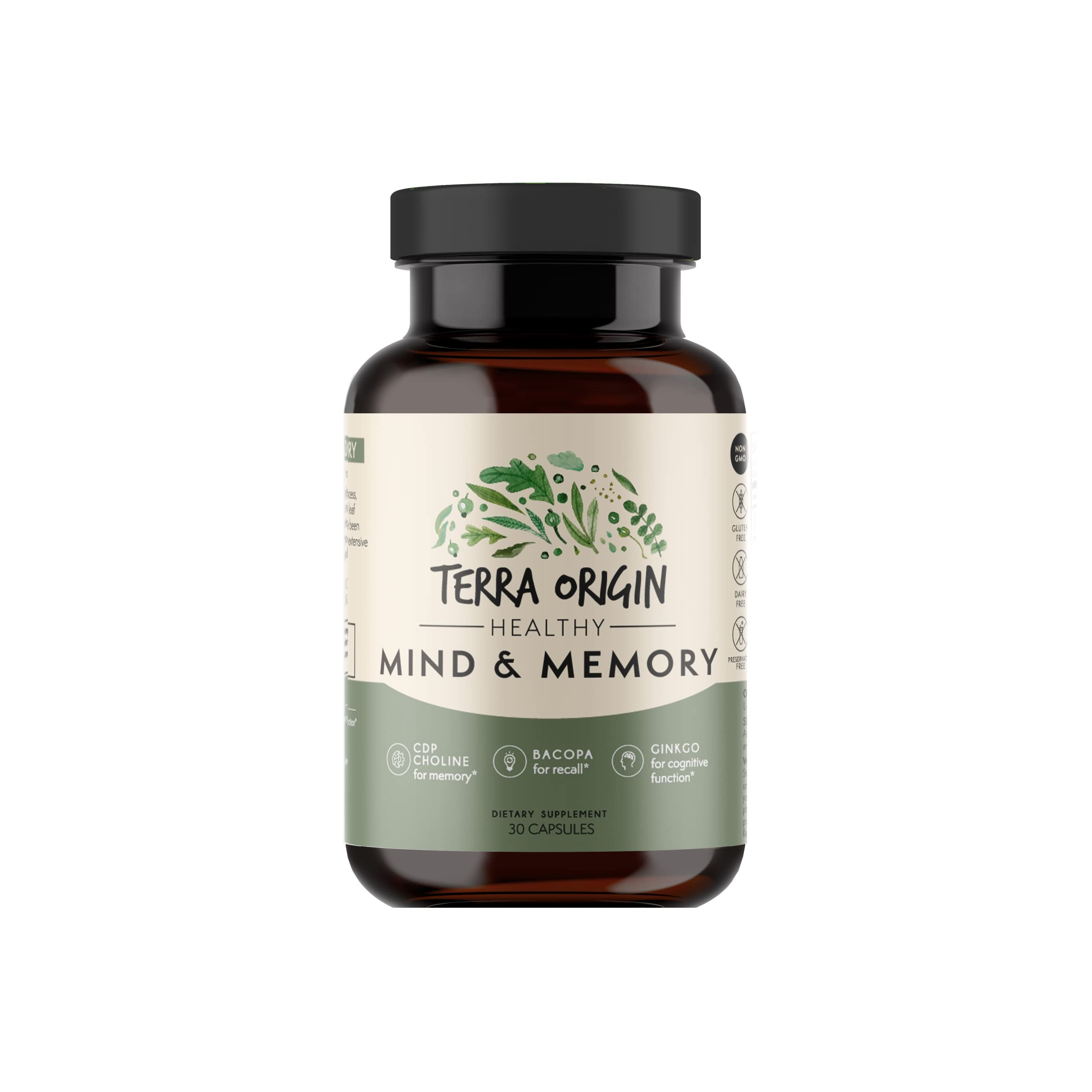 TERRA ORIGIN Healthy Mind and Memory Support Supplement | Cognitive Memory Matrix | Nootropic CDP Bacopa L-Tyrosine Huperzine A Ginko B12 | Non GMO Gluten Free Dairy Free | 30 Capsules