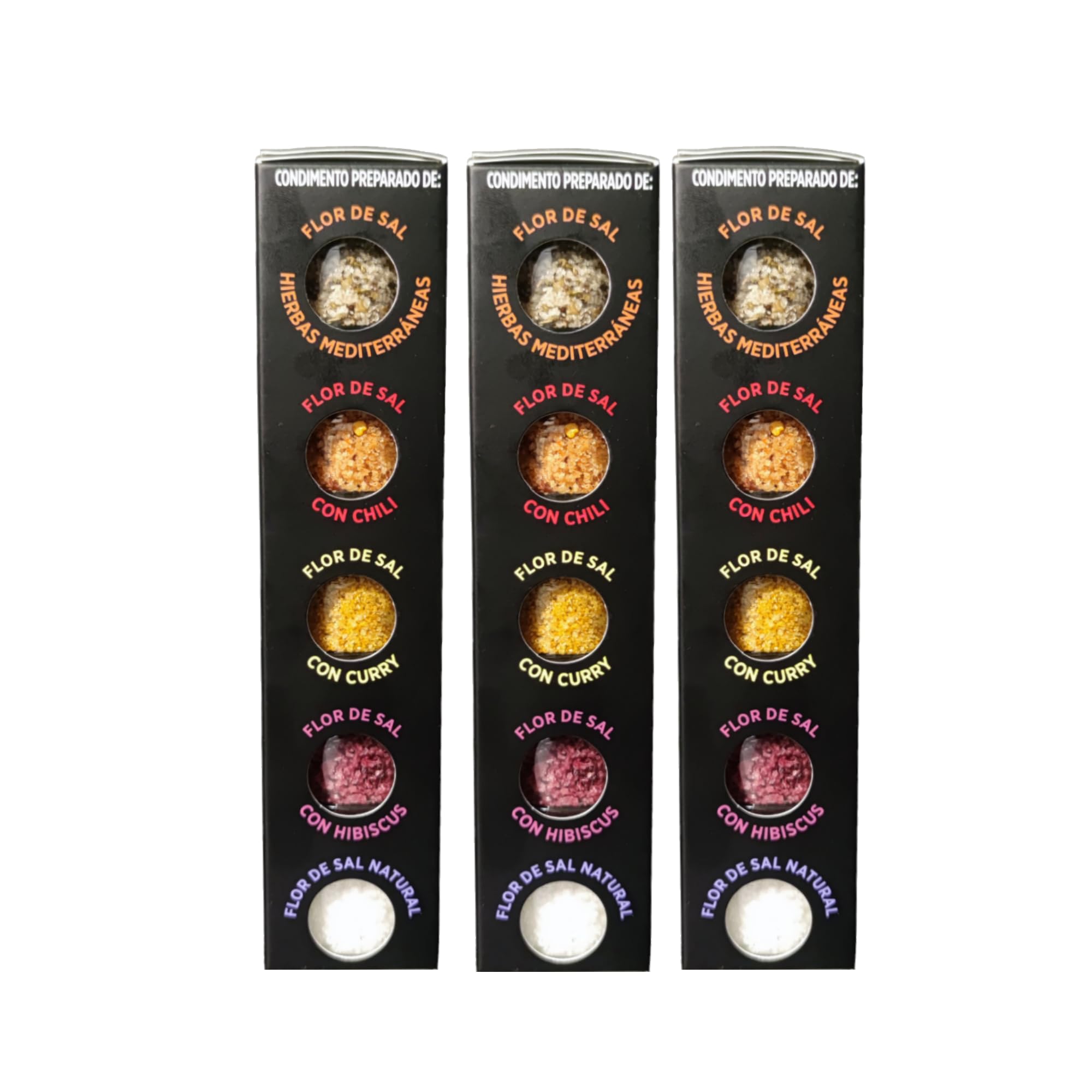 Terramar Mallorca Flor de Sal Gourmet Pack of 3 x 5 Majorcan Sea Salts (15 x 20 g) These wonderful tins from Terramar Mallorca contain the following salts: 3 x Flor de Sal con Hierbas Mediterráneas - Sea Salt with Mediterranean Herbs Ingredients: Sea salt 96 and 4 spices (oregano, thyme, marjoram, rosemary, basil) 3 x Flor de Sal con Chili - Sea Salt with Chili Pepper Ingredients: Flor de Sal sea salt 94 , cayenne pepper 3 , and chili pepper 3 3 x Flor de Sal with Curry - Curry Sea Salt Ingredients: Flor de Sal sea salt 95 , curry spice 5 (turmeric, fenugreek, cornmeal, cloves, cumin, cayenne pepper) 3 x Flor de Sal with Hibiscus - Sea Salt with Hibiscus Flowers Ingredients: Poil de Sal sea salt 97 and hibiscus flowers 3 3 x Flor de Sal Natural - Natural Sea Salt Ingredients: Poil de Sal 100 sea salt This Mallorcan sea salt is sun-dried and untreated in Mallorca. Gourmets worldwide appreciate its distinctive flavor. Net contents: 300g (3 x 100g) Packaged in attractive, decorative, resealable 20g jars (disposable). Storage instructions: Store in a dry place away from moisture. Manufacturer: Terramar Mallorca S.C. Es Pinar de Sa Coma, Poligon 29 Parcela 714, 35 Manacor Majorca Spain INSTRUCTIONS FOR USE Use Flor de Sal Gourmet salts to enhance the flavor of fish, meat, salads, and vegetables. Ideal for cooking, barbecuing, and grilling. The different flavors can be used to add a unique touch to your dishes. Store the salt in a dry place.TERRAMAR MALLORCA - Lot de 3 flacons de sel gourmand Flor de Sal Black Edition - Sel de mer et épices de Majorque - Idée cadeau idéale (3 x 100 g)DESCRIPTION DU PRODUIT DESCRIPTION DU PRODUIT Terramar Majorque. Flor de Sal Gourmet Lot de 3 x 5 sels de sel de mer de Majorque (15 x 20 g) Ces merveilleuses boîtes de la marque Terramar Mallorca contiennent les sels suivants : 3 x Flor de Sal con Hierbas Mediterráneas - Sel de mer aux herbes méditerranéennes Ingrédients: Poil de Sal sel de mer 96 et 4 épices (origan, thym, marjolaine, romarin, basilic) 3 x Flor de Sal con Chili - Sel de mer au piment. Ingrédients : Poil de Sal sel de mer 94 , poivre de Cayenne 3 et piment 3 3 x Flor de Sal con Curry - Sel de mer au curry Ingrédients: Flor de Sal sel de mer 95 , épice au curry 5 (curcuma, fenugrec, semoule de maïs, clou de girofle, cumin, poivre de Cayenne) 3 x Flor de Sal con Hibiscus - Sel de mer aux fleurs d'hibiscus Ingrédients: Poil de Sal sel de mer 97 et fleurs d'hibiscus 3 3 x Flor de Sal Natural - Sel de mer naturel Ingrédients : Poil de Sal 100 sel de mer Ce sel de mer de Majorque est séché non traité au soleil de Majorque. Les gourmets du monde entier apprécient son goût particulier Contenu (quantité nette) : 300 g (3 x 100 g). Mise en bouteille : dans de beaux bocaux décoratifs et refermables de 20 g (jetables). Consignes de stockage : conserver au sec et à l'abri de l'humidité. Fabricant : Terramar Mallorca S.C. Es Pinar de Sa Coma, Poligon 29 Parcela 714, 35 Manacor Majorque Espagne MODE D'EMPLOI Utilisez les sels Flor de Sal Gourmet pour affiner le goût du poisson, de la viande, des salades et des légumes. Idéal pour la cuisine, le barbecue et le barbecue. Les différentes saveurs peuvent être utilisées pour ajouter une touche unique à vos plats. Conservez le sel au sec.