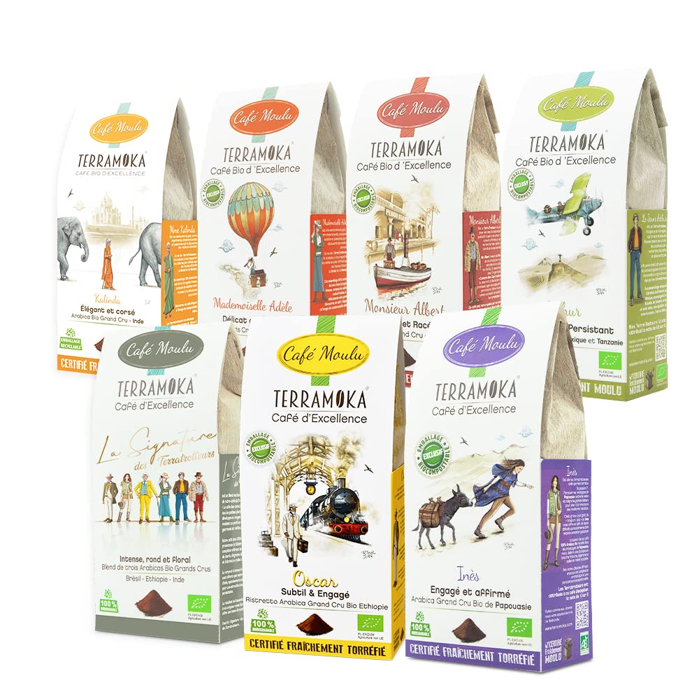 TERRAMOKA - Café Moulu Bio d'excellence - Coffret Cadeau Dégustation - Mix 7 Café Grand Cru - Cafe moulu 1750g (7 250g) - Torréfié en France