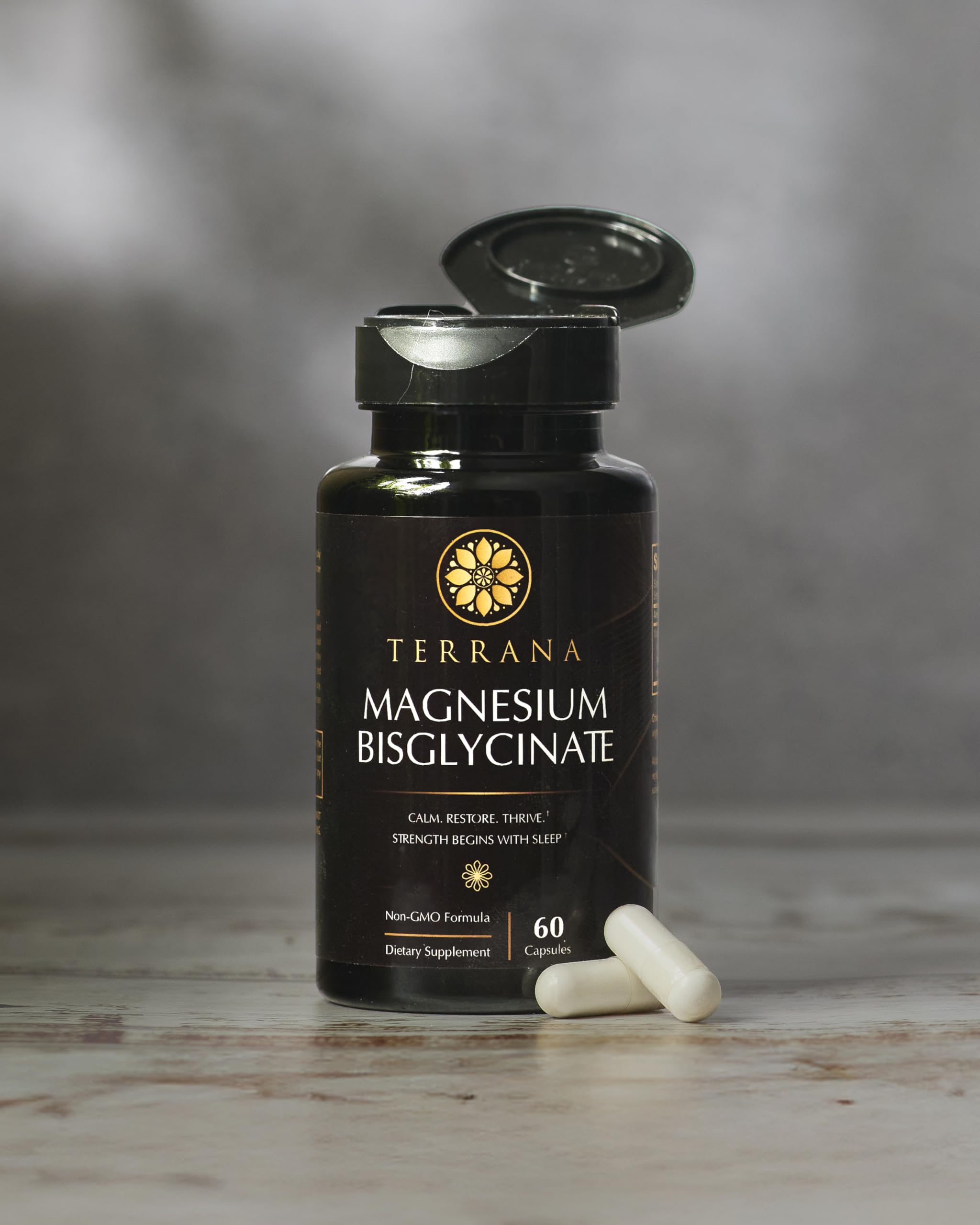 Support your wellness routine with Terrana Magnesium Bisglycinate — a premium, bioavailable form of magnesium designed for optimal absorption and gentle digestion. Formulated to help replenish magnesium levels, this supplement supports muscle function, energy production, and overall well-being. Each serving provides 200mg of elemental magnesium from fully reacted magnesium bisglycinate, known for its superior absorption without the laxative effect commonly associated with other forms. Whether you're active, health-conscious, or simply looking to fill nutritional gaps, Terrana Magnesium Bisglycinate is a clean, reliable choice. Our vegan-friendly capsules are made without magnesium oxide or fillers and are third-party tested for purity and potency. Manufactured in a GMP-certified facility in the USA, we're committed to providing a supplement you can trust, with transparency at every step.