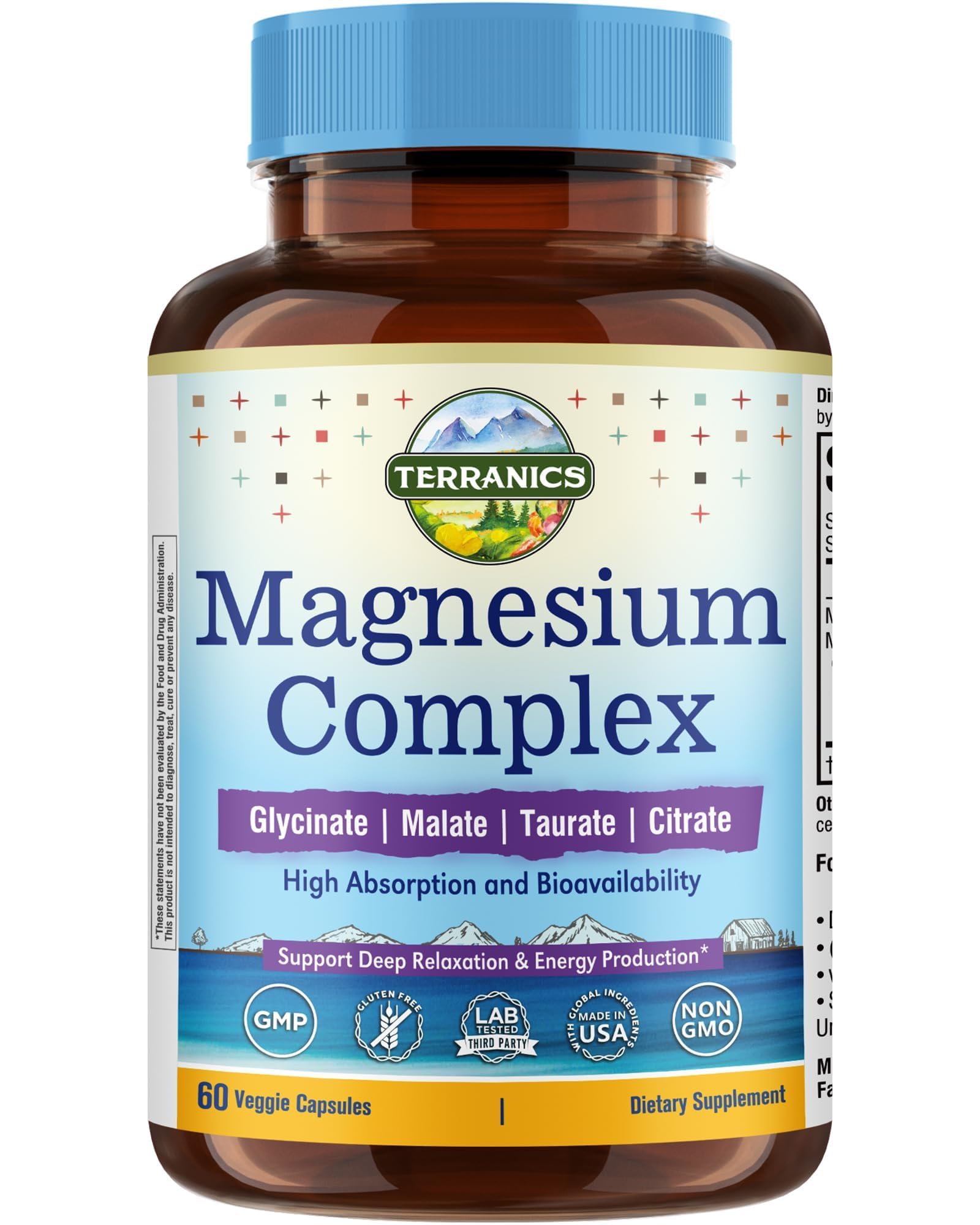 Unlock the Power of Nature: We hold deep respect for the power and wisdom of the Mother Earth and never attempt to modify what it should be in nature. That's why all of our ingredients are fresh and pure. Terranics is dedicated to delivering a world of nutrition without any man-made modification and is committed to leaving the smallest carbon footprint possible. Proudly Made in the USA: Terranics Magnesium Complex is made in the USA in a state-of-the-art, GMP-Certified facility under the highest possible standards. Every probiotic capsule is lab tested for purity, quality, and potency. Heart Protection Digestive Health : Magnesium taurate in this magnesium complex helps promote healthy circulation and support electrolyte balance for a normal heart rhythm. This carefully balanced combination also includes magnesium citrate, highly beneficial to the digestive system, to encourage regular, healthy bowel movements. . Restful Sleep All-Day Energy : This formula combines magnesium glycinate - known for its calming properties and excellent stomach tolerance - with magnesium malate to fuel your daily energy. Glycinate soothes the nervous system for better rest without morning grogginess, while malate supports cellular energy to help your body recover and perform at its best. . Premium 4-in-1 Magnesium Complex: Terranics Magnesium Complex delivers 500mg of total magnesium from four highly bioavailable chelated forms - magnesium glycinate, malate, taurate, and citrate - for optimal absorption and full-body support. We skip cheap and poorly absorbed forms like magnesium oxide or buffered blends. Gentle on the stomach and designed to complement your daily magnesium intake from food. .