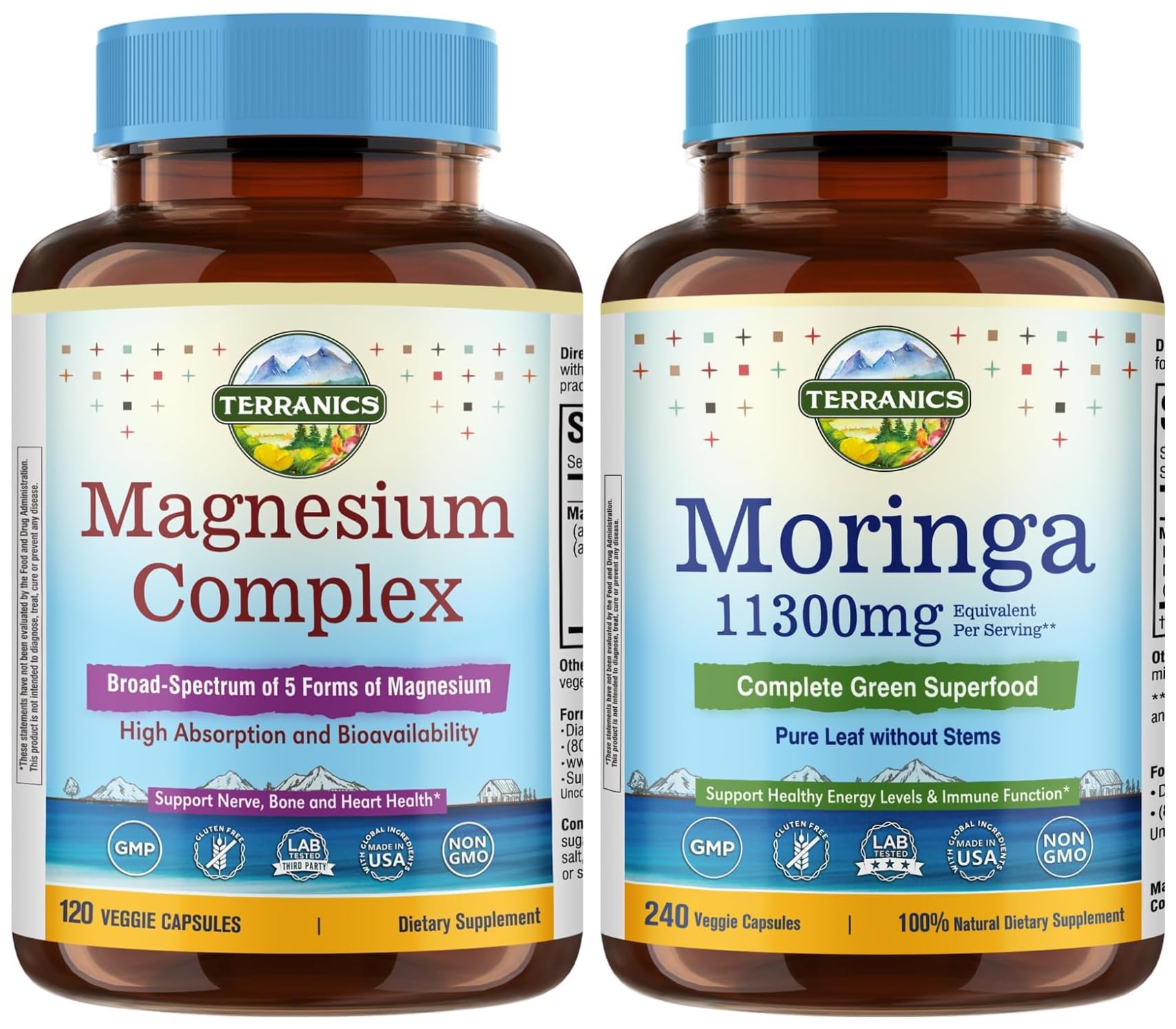 500mg of high-absorption 5-form Magnesium Complex and 11300mg of pure Moringa Leaf Powder, both Non-GMO, Gluten-Free Vegan.Unlock the Power of Nature: We hold deep respect for the power and wisdom of the Mother Earth and never attempt to modify what it should be in nature. That's why all of our ingredients are fresh and pure. Terranics is dedicated to delivering a world of nutrition without any man-made modification and is committed to leaving the smallest carbon footprint possible. Proudly Made in the USA: Terranics Moringa is made in the USA in a state-of-the-art, GMP-Certified facility under the highest possible standards. Every capsule is third-party tested for purity, quality, and potency. Equivalent to 11300mg Moringa Leaves: Terranics Moringa supplement provides 11300mg strength of nutrient-rich moringa leaves per serving, no moringa stems added. These green leaves are grown in tropical farms where moringa thrives, hand-picked at peak potency, and carefully processed at ultra-low temperatures to retain maximum freshness nutrients. Magnesium Complex Supplement from Superior Ingredients: Magnesium is essential for over 300 bodily functions and supports energy production and protein synthesis . Crafted from pristine, non-GMO ingredients, it's meticulously soy, dairy, and gluten-free, perfect for those with dietary sensitivities. Our vegetarian magnesium capsules are conscientiously formulated without egg, peanuts, tree nuts, fish, shellfish, corn, milk, soybean, and wheat. Five Premium Chelated Magnesium Forms-Magnesium Glycinate, Citrate, Malate, Aspartate Gluconate : Terranics Magnesium Complex champions a comprehensive approach to magnesium supplementation with five chelated forms. These exceptional elemental magnesium sources are carefully designed for high absorption by your body. Our magnesium complex capsules can support your health and wellness goals.