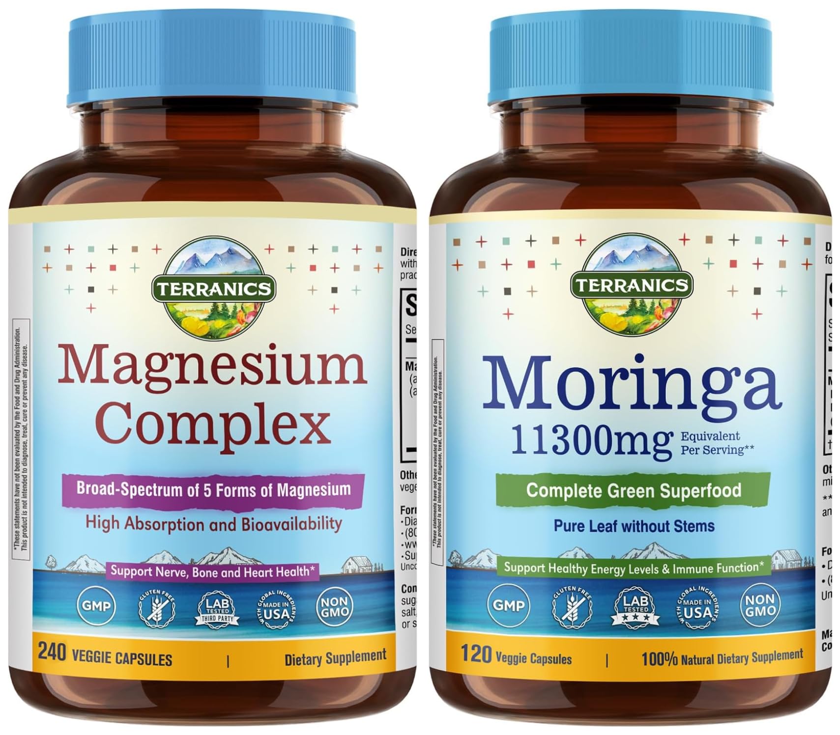 Terranics Magnesium Complex & Moringa Capsules Bundle - 500mg 5 Forms Magnesium Glycinate Citrate Malate Aspartate Gluconate + 11300mg Pure Moringa Leaf Powder 240 Caps + 120 Caps