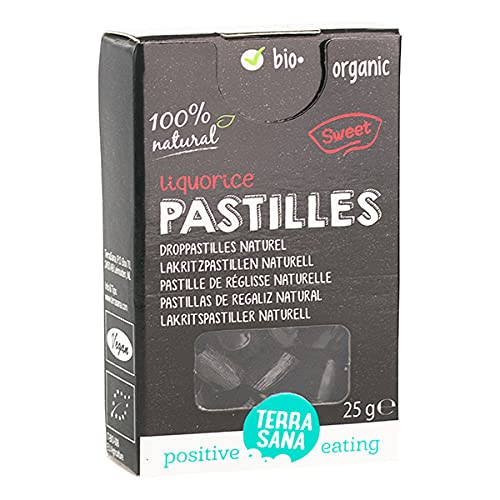 Pure licorice lozenges with no added sugar. 25g.Natural Licorice Lozenges 25g. Terrasana. Lozenges. Organic Confectionery. Sweet Groceries. Pastilles de réglisse pure sans sucre ajouté. 25g.Pastille De Réglisse Naturelle 25G. Terrasana. Pastille. Confiserie Bio. Epicerie sucrée.