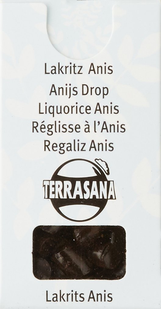 Yeast-free. Lactose-free. Gluten-free. Organically grown.Sans levure. Sans lactose. Sans gluten. Issue de l'agriculture biologique.Terrasana Pastilles Réglisse Anis Bio 25 g