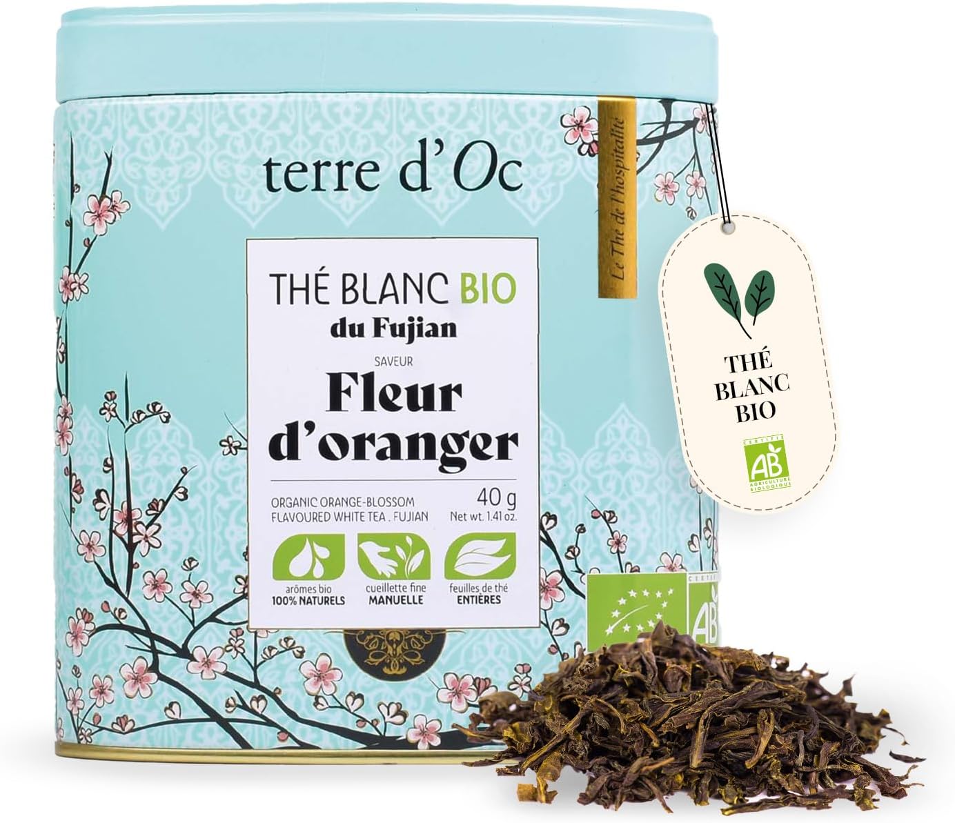 terre d'Oc - Organic White Tea from Fujian - Orange Blossom Flavor - Metal Box - Loose Leaf - Gift Idea for Men and Women -