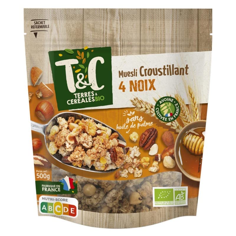 EARTH AND CEREALS. EARTH AND CEREALS ORGANIC CRUNCHY MUESLI WITH 4 NUTS 500G. ORGANIC. Dietary and nutritional products. Savory grocery items.TERRES ET CEREALES. TERRES ET CÉRÉALES MUESLI CROUSTILLANT BIO 4 NOIX 500G. BIO. Diététique et nutrition. Epicerie salée.TERRES ET CEREALES - TERRES ET CÉRÉALES MUESLI CROUSTILLANT BIO 4 NOIX 500G - LOT DE 2