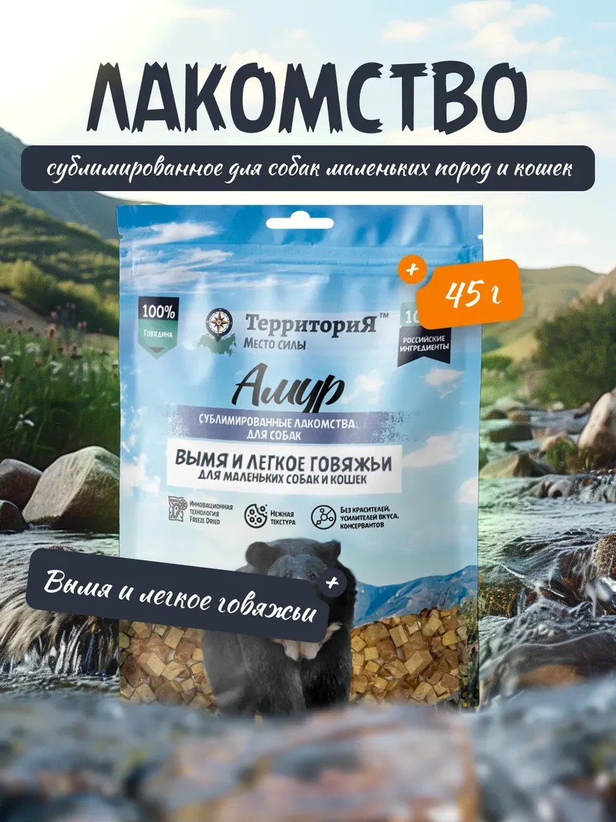 The Amur line of Udder and Lungs for dogs is more than just a treat that can be used as a training reward for dogs of all breeds and ages. It's a highly beneficial product. Udder and Lungs dog treats are made using freeze-drying technology. The ingredients in TerritoryYa treats are delivered fresh to the factory. To preserve their beneficial properties, they undergo ultra-fast freezing. Then, in a vacuum chamber, the sublimation process occurs, causing the frozen moisture in the treats to evaporate without liquefying. This means only the water is removed, and the udder for dogs retains all its beneficial properties. Freeze-dried treats retain their original aroma and flavor. These treats can be given to your dog dry or soaked (adding warm water completely restores the texture of fresh meat). Dog udders are easy to break into small pieces, making them ideal for training or treating dogs, including small breeds.