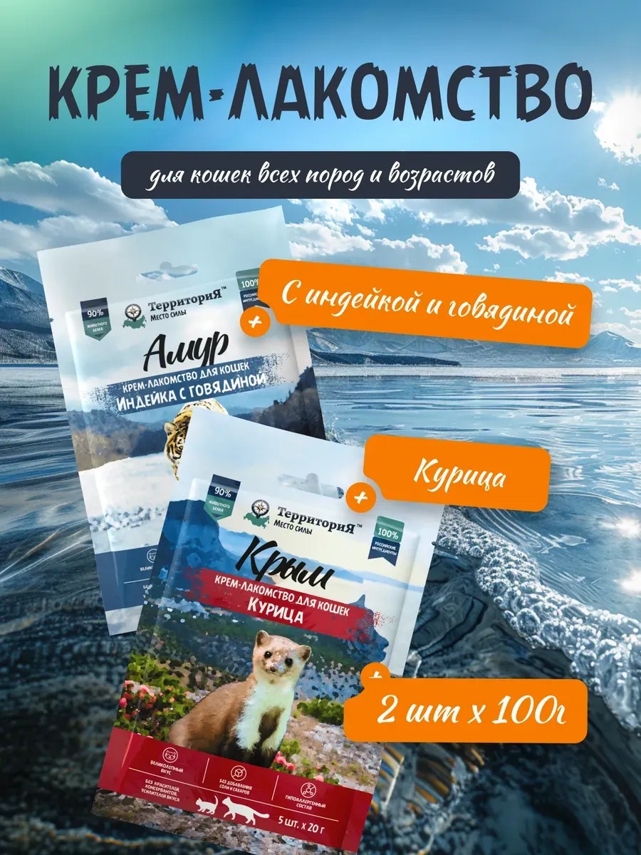 Cream Cat Treats "Amur" Beef and Turkey and "Crimea" Chicken are delicious and healthy treats for pets of all ages, including senior cats. Their delicate, creamy texture makes these treats easy to digest and suitable even for pets with sensitive teeth or reduced appetites. The natural ingredients, including fresh meat and a small amount of vegetables, provide nutritional value and support your pet's health. These treats can be enjoyed as a standalone treat, added to their main diet to enhance its palatability, or given by hand to create a special bond with your pet. Suitable for spayed and neutered cats, provided they are fed within the recommended feeding guidelines. The appetizing aroma will please even the most discerning gourmets. Ideal for cat breeds such as Egyptian Mau, Savannah, Oriental Shorthair, Turkish Van, and Burmese.