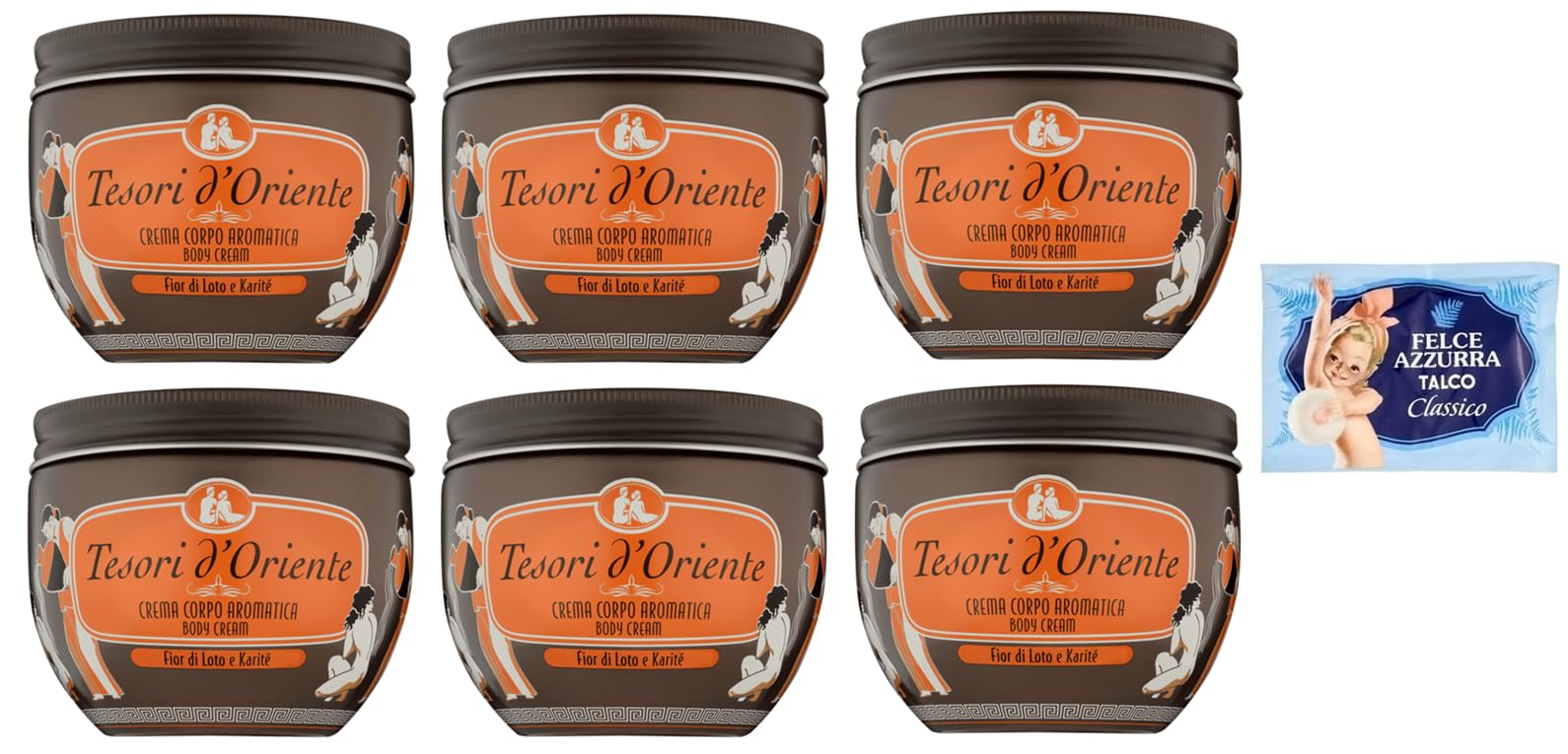 Tesori d'Oriente Crema Corpo Fior di Loto e Shea Body Cream with Lotus Flower and Shea 300 ml + 1 x Felce Azzurra Talcum Powder 100 g Pack of 6