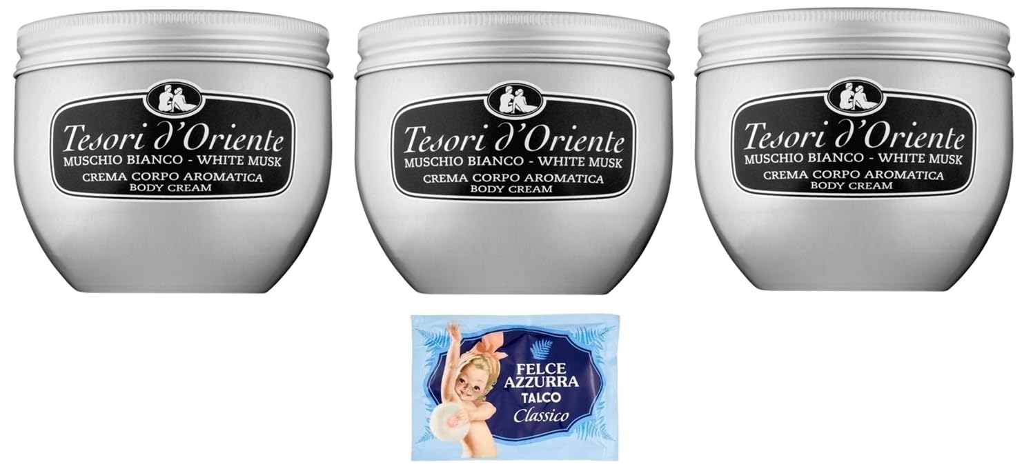 Tesori d'Oriente Crema Corpo Muschio Bianco Body Cream White Musk 300 ml + 1 x Felce Azzurra Talcum Powder 100 g Pack of 3
