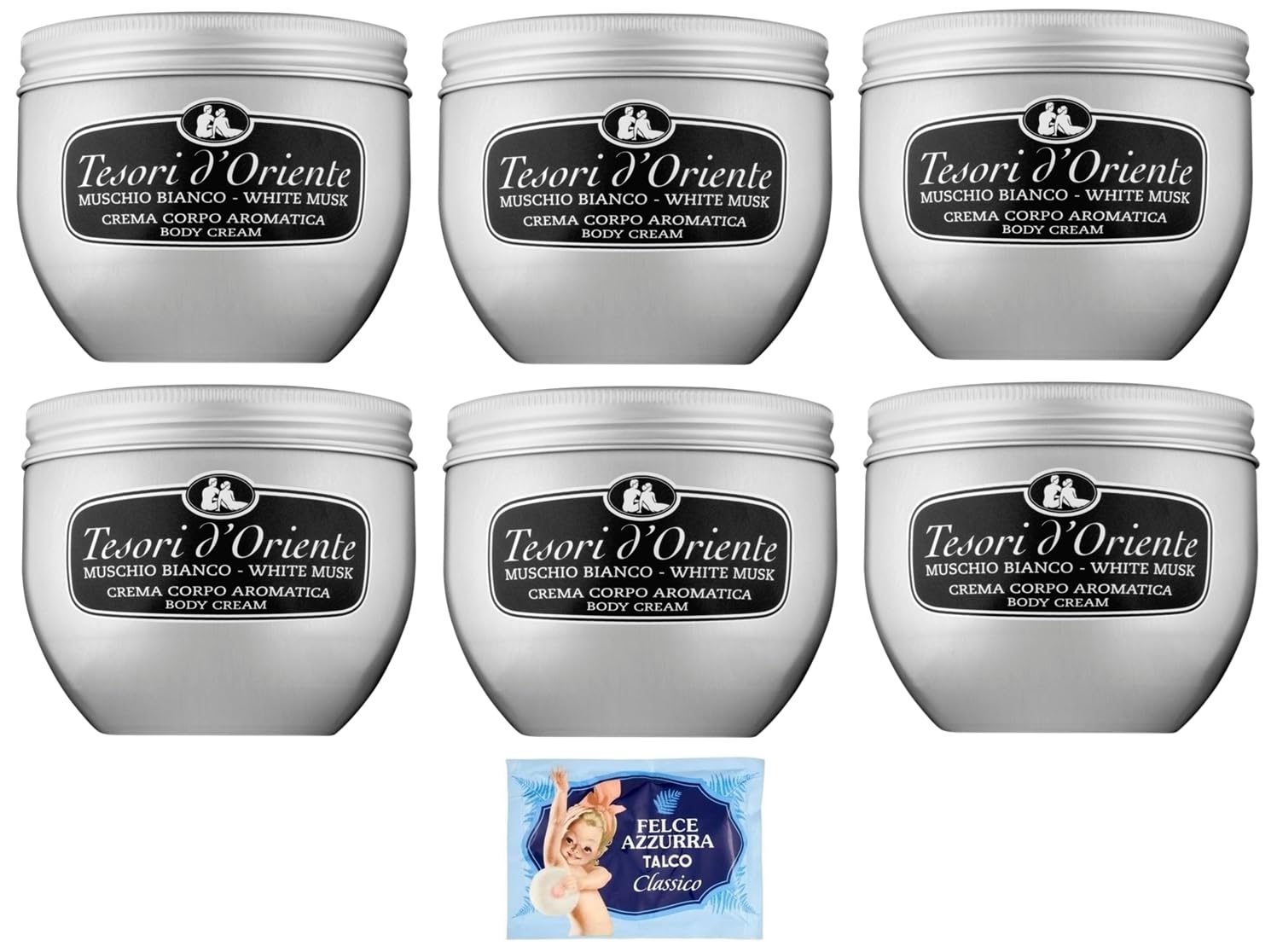Tesori d'Oriente Crema Corpo Muschio Bianco Body Cream White Musk 300 ml + 1 x Felce Azzurra Talcum Powder 100 g Pack of 6