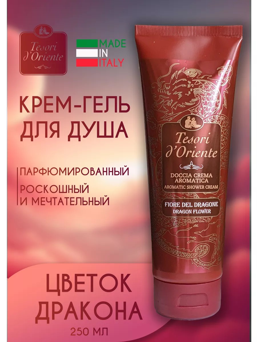 Tesori d’Oriente парфюмированный гель для душа Цветок Дракона 250 мл приглашает Вас окунуться в мир баланса и гармонии. Уникальная разработка итальянских парфюмеров создает парфюмированный гель для душа с ярким ароматом, обладающим хорошей стойкостью до 3 часов и уходовыми свойствами лосьона для тела. Гель для душа женский и мужской обеспечит бережное увлажнение и питание для вашей кожи, сделает тело гладким и шелковистым. Вдохновленный философией Востока, ингредиентами и ароматами, Tesori d'Oriente создает новый ритуал благополучия для возрождения тела и ума, восстанавливая состояние внутренней гармонии. Его аромат создает шарм загадочности и восточной роскоши, а 5 драгоценных масел ухаживают за кожей, делая ее нежной как шелк. Тезори Д'ориенте переводится как "Сокровище Востока". Натуральные масла в составе геля для душа, итальянское производство, формулы без парабенов и силиконов, синтетических красителей – это всё является атрибутом высокого ценового сегмента. Благодаря такому составу, гели для душа не только очищают кожу, но и эффективно ухаживают за ней. Ароматизированный крем гель для душа увлажняющий Вашу кожу прекрасно подходит для ежедневного применения. Ароматические композиции разработаны ведущими мировыми парфюмерными компаниями и подойдут для подарка себе и близким людям: маме, подруге или папе и другу, потому что привлекательная и удобная упаковка имеет премиальный вид. Подарок подойдет как и для мужчин, так и для женщин на 14, 23 февраля и 8 марта, день рождения. Насладитесь роскошью гармонии Востока!
