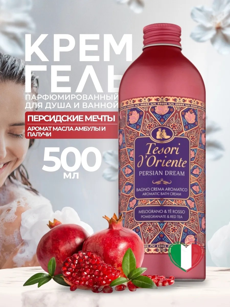 Сочетание ароматов, в которой чувственные ноты жасмина и сладкие и пряные ноты граната смешиваются с оттенками красного чая и теплыми оттенками янтаря, рождая светящуюся и завораживающую эссенцию, воспевающую возрождение природы. Пленящий и искушающий аромат персидских садов собран в парфюмернном геле для душа Tesori d’Oriente Persian Dream. Уникальная разработка итальянских парфюмеров создает универсальный парфюмированный гель для душа с ярким ароматом, обладающим хорошей стойкостью до 3 часов и уходовыми свойствами лосьона для тела. Гель предназначен как для нее, так и для него. Универсальность продукта делает его идеальным подарком для любой аудитории: будь то девушки, мамы или мужчины, каждый найдет в нем что-то особенное. Крем гель для душа соблазняет нотами парфюма и создает ощущение свежести после каждого применения. Гель для душа является отличным выбором для мужчин и женщин, кто ищет невероятно соблазнительные и приятные ароматы. Благодаря увлажняющему эффекту кожа становится более мягкой и бархатистой на ощупь. Парфюмированный крем гель для душа — это настоящее спасение в стрессовые будни, приносящая уютную атмосферу уюта прямо в вашу ванную/ Кроме того, он идеально подходит для использования как уникальный подарок близкому человеку на любое событие или даже без повода — чтобы выразить свою заботу и внимание к деталям. Во флаконе содержится настоящая сила природы и современных технологий по уходу за кожей. Парфюмированный гель создан специально для тех, кто ценит баланс традиций с инновациями. Невероятные натуральные ароматы согревают легкостью изысканностью с намеком на роскошь классического парфюма. Увлажняющий эффект защищает кожу от негативного воздействия окружающей среды и способствует поддержанию её естественного увлажнения. Идеальное сочетание ароматов поднимает настроение с первых минут нанесения средства во время принятия душа или купания в ванной.