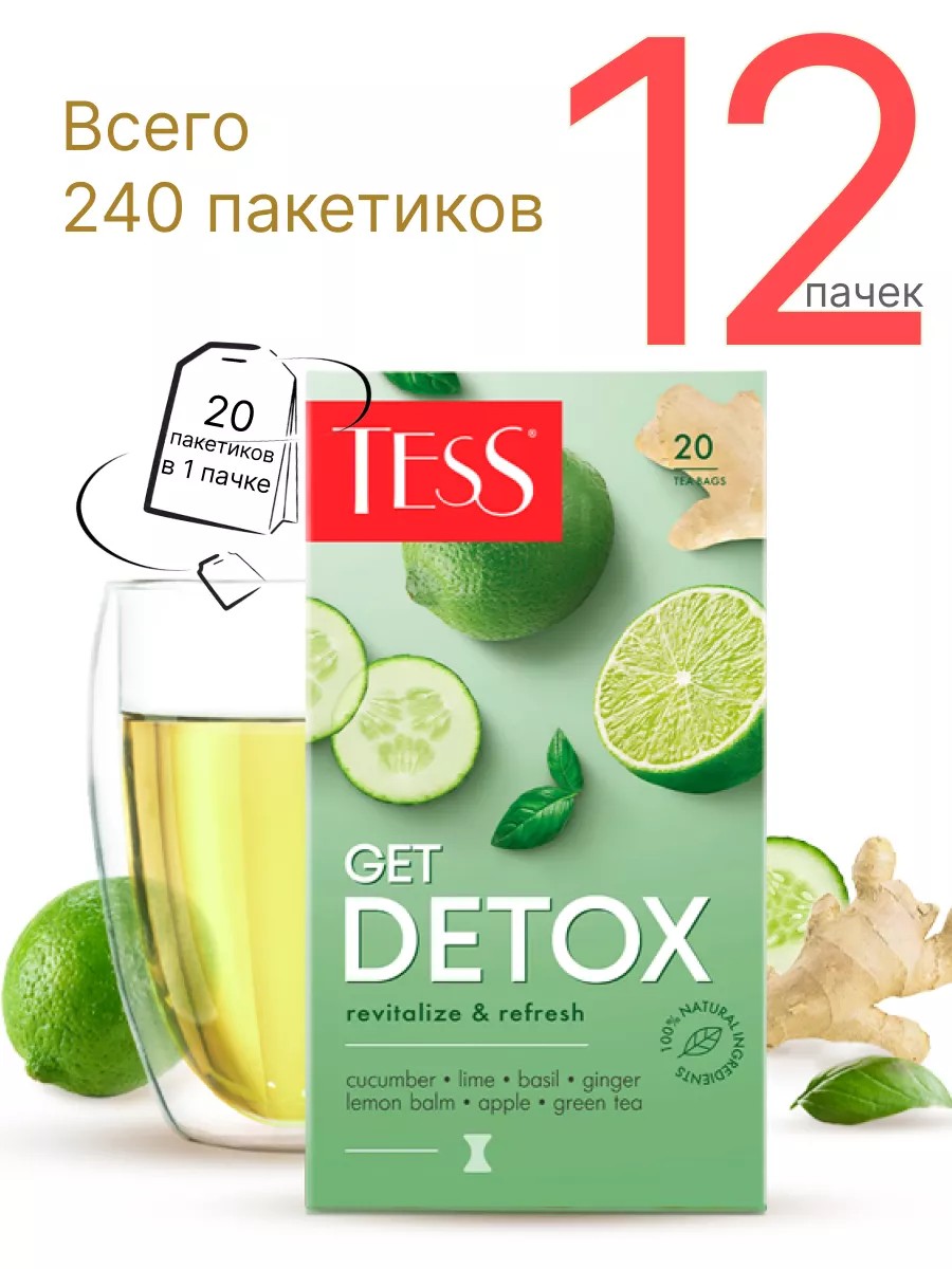 | Комплектация | Всего 240 пакетиков; Чай Tess Get Detox с лаймом и свежим огурцом - 12 пачек по 20 пакетиков |