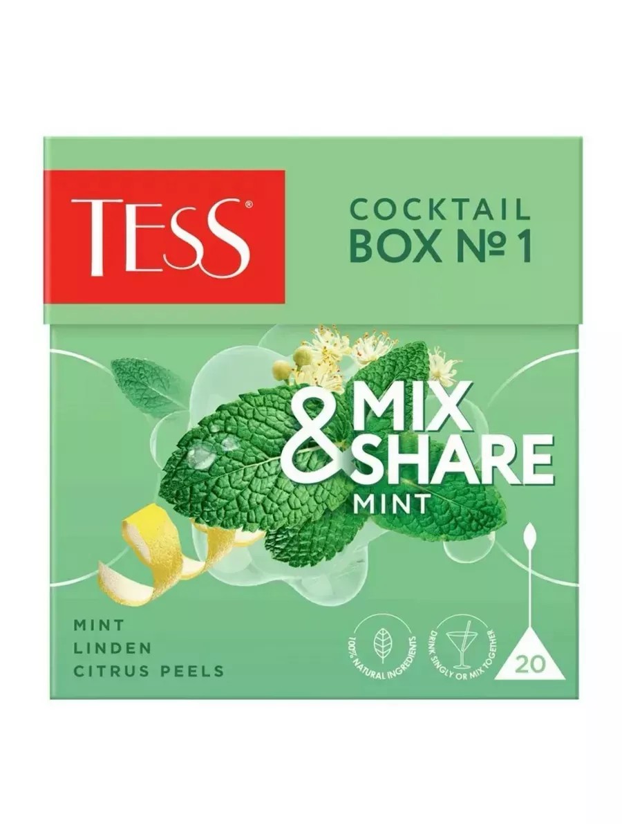Tess чай травяной cocktail box №1 мята в пирамидках 20 пак. х 1,5 гр. Ощути бодрящую прохладу мяты с теплым акцентом липы и солнечной искрой цитруса. Наслаждайся нашей уникальной коллекцией из четырех натуральных купажей! Пробуй вкусы по отдельности или завари две пирамидки из разных упаковок, чтобы смешать и получить 400 мл коктейльного настроения для компании друзей.
