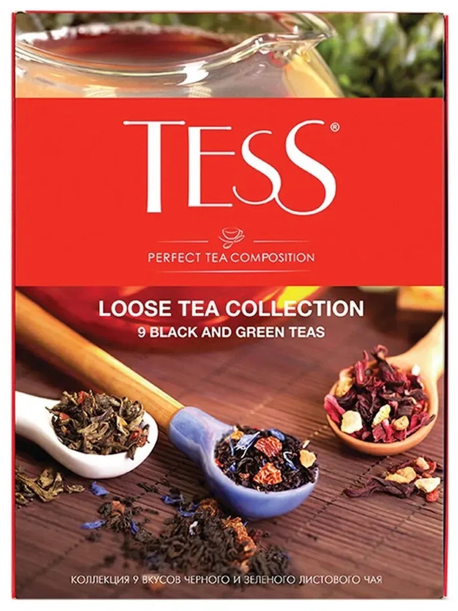 Tess, Loose Tea Collection Assorted 9 Types, 350g. The Tess loose tea collection features classic black and green tea varieties grown on plantations in Ceylon, India, and China, as well as exquisite blends in which high-quality tea leaves are harmoniously combined with natural fruits, berries, flower petals, and fragrant herbs. Each blend in the Tess loose tea collection is a magnificent example of the fusion of centuries-old tea traditions, innovative style, and inspired improvisation in tea composition. The set includes the following tea varieties: Tess Sunrise (black Ceylon large-leaf tea), 25 g. Tess Ceylon (black Ceylon highland tea), 40 g. Tess Pleasure (black tea with tropical fruit aroma and herbal ingredients), 40 g. Tess Orange (black tea with orange aroma and herbal ingredients), 40 g. Tess Thyme (black tea with lemon and thyme aroma and herbal ingredients), 40 g. Tess Goldberry (black tea with sea buckthorn and quince aroma and herbal ingredients), 40 g. Tess Style (green large-leaf tea), 45 g. Tess Lime (green tea with lime aroma and herbal ingredients), 40 g. Tess Flirt (green pekoe with the aroma of white peach and strawberry and herbal ingredients), 40 g. Storage conditions: in well-ventilated areas with a relative humidity of no more than 70%.