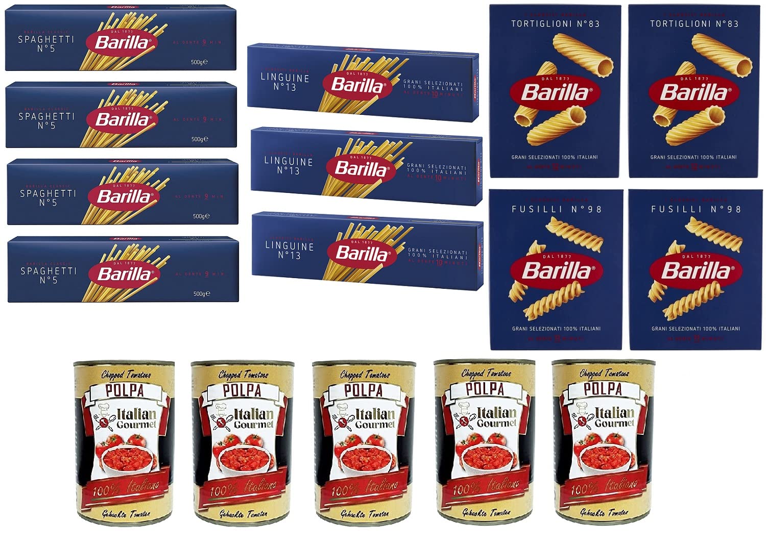 Testpakket Barilla pasta pasta pasta spaghetti linguine fusilli tortiglioni 11 x 500 g en Italiaanse gourmet Polpa di pomodoro fijn gehakte tomatenpuree 5 x 400 g