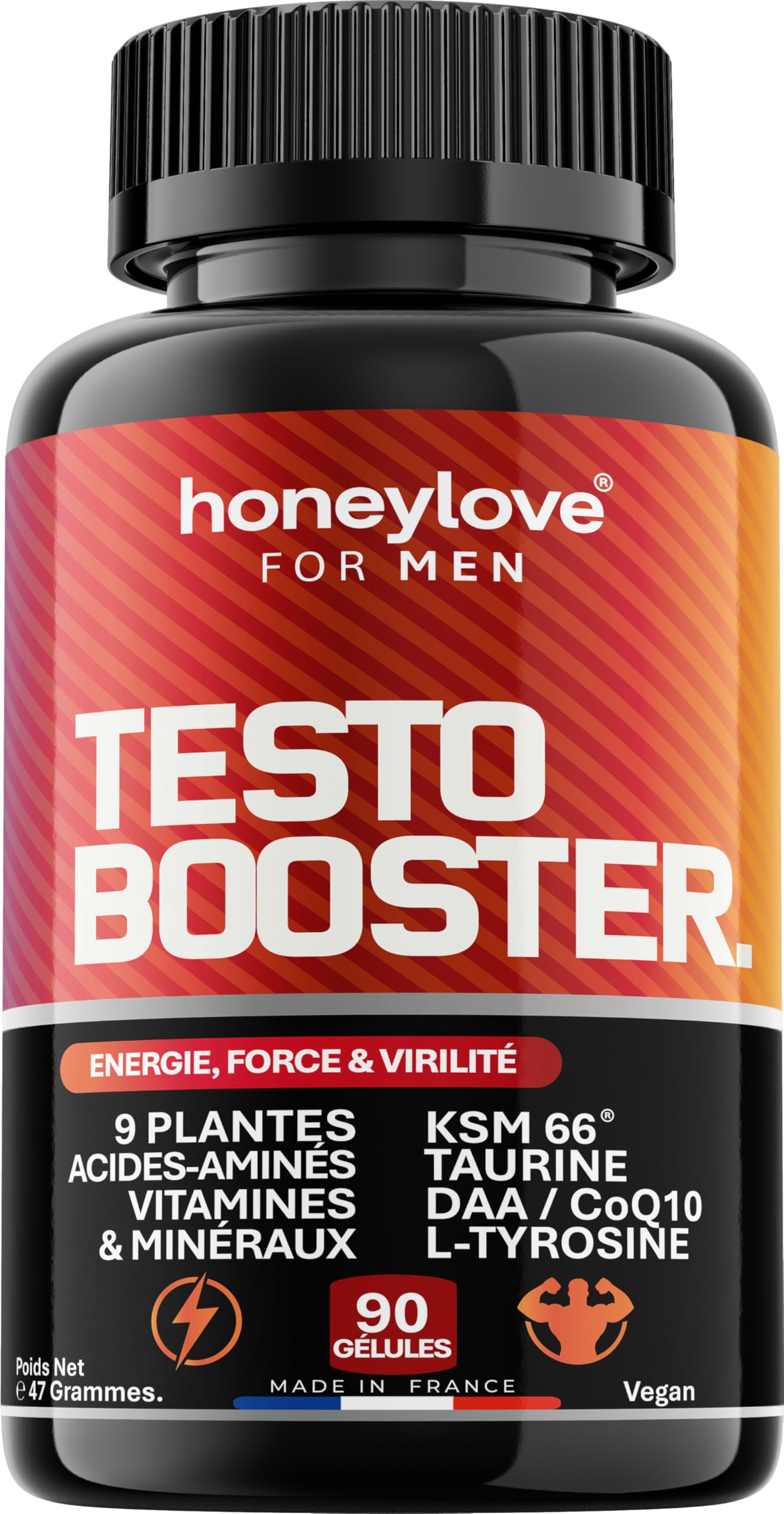 Made in France in a laboratory applying HACCP methods, according to the highest quality standards controls carried out by independent laboratories. No animal gelatin, gluten-free, lactose-free. 100 vegan formula. Piperine (Black Pepper): Improves the absorption of ingredients, guaranteeing maximum effectiveness and rapid results. Taurine Ginseng: Increase endurance and reduce fatigue, ensuring peak physical performance. Coenzyme Q10: Supports cellular energy production and protects muscles from oxidative stress for lasting vitality. ? L-Tyrosine Kola Nut: An energizing duo that boosts concentration and alertness, perfect for high physical and mental performance. Saw Palmetto: Protects the prostate and maintains a healthy hormonal balance, preventing the excessive conversion of male hormones into DHT. Peruvian Maca: Strengthens couple's vitality and optimizes overall energy, promoting balanced hormonal well-being. Ashwagandha KSM 66: Reduces stress and increases physical and mental endurance, with clinically proven results on muscle strength. Tribulus Terrestris: Naturally stimulates testosterone production thanks to its saponins, thus supporting muscle strength and endurance. Product expiration date for this batch: July 2026.