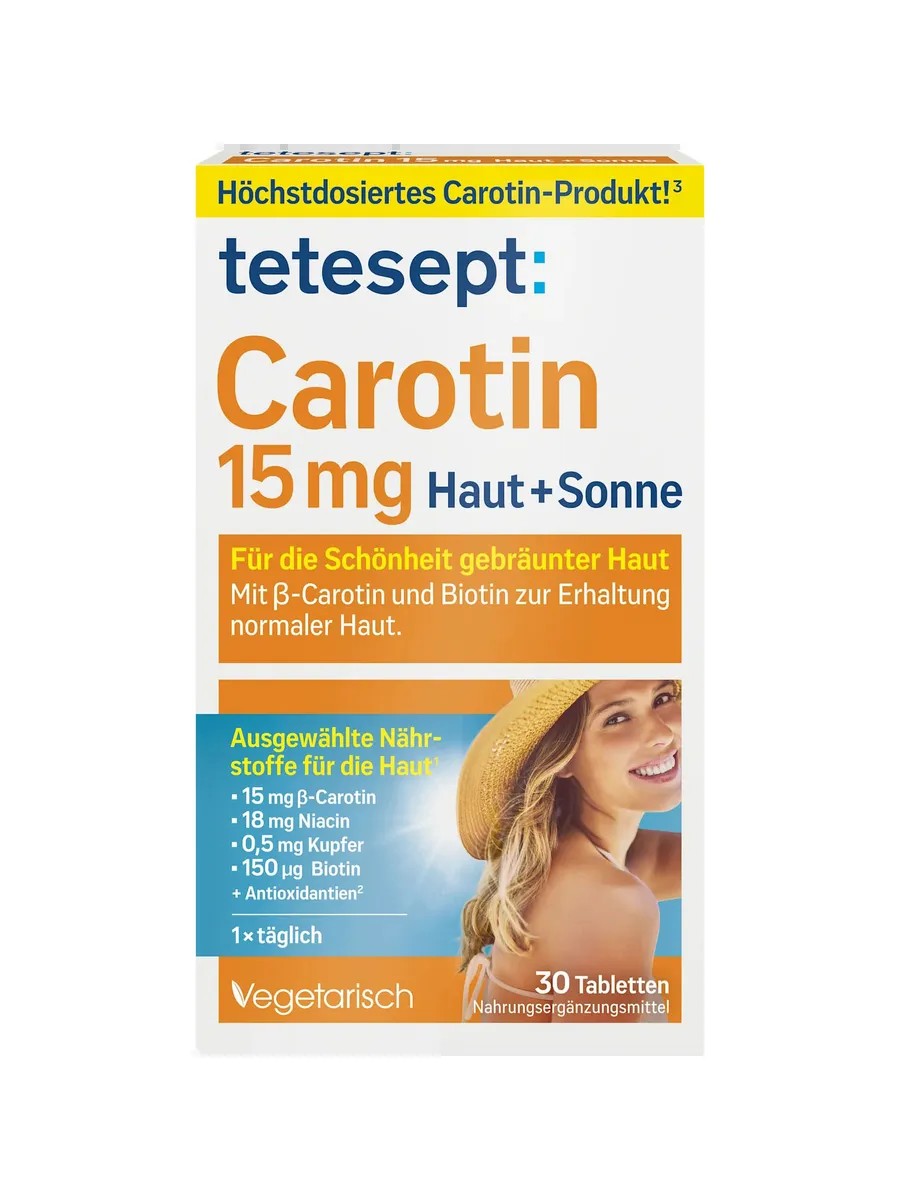 Tetesept Carotene 15 mg Tablets for Skin + Sunshine contribute to the normal maintenance and function of skin with vitamin A, biotin, niacin, and zinc.