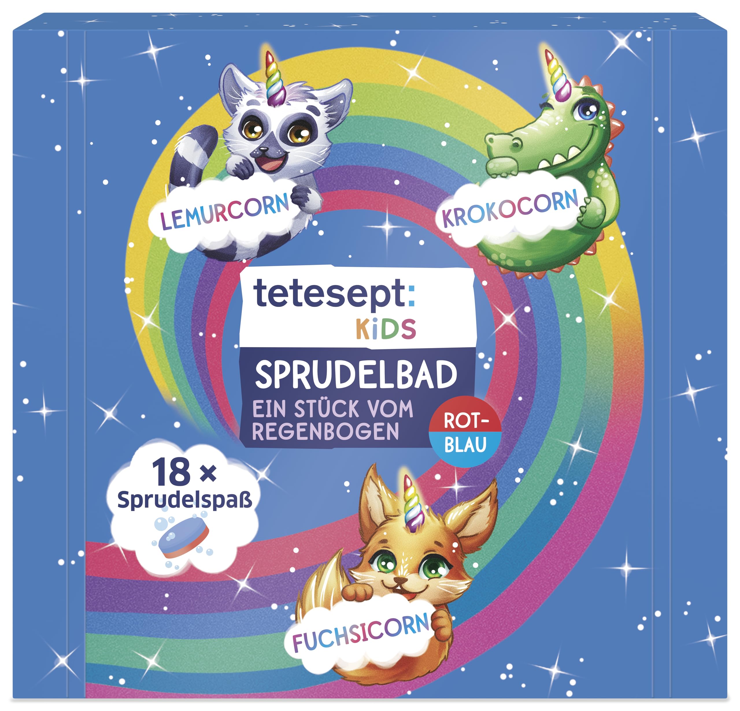 tetesept Kids Rainbow Bath Fizzers (18 x 20g) Want to magically change color? No problem with tetesept Kids Rainbow Bath Fizzers. The two-tone red and blue fizzing tablets dissolve in the water to create a new color, turning the bathwater purple – like magic! The adorable rainbow animals Foxicorn, Lemucorn, and Crococorn show that everyone can be a rainbow unicorn. This children's bath additive also has a skin-care formula, ideal for children's delicate skin. Directions: Fill the bathtub with plenty of warm water and add one fizzing tablet. Bathe for 10 to 20 minutes at 35 to 38 C, depending on your preference. Rinse the bathtub with warm water after bathing to remove any product residue. Product Information: Sparkling bath fun. Two-tone red and blue bath fizz tablets. Individually wrapped tablets with 3 different designs. Gentle skin care. Food coloring turns the water purple. Tips: Avoid direct contact of the bath fizz with eyes. Keep out of reach of children. Avoid direct contact of the bath additive with delicate surfaces and objects. Store in a dry place, away from heat and direct sunlight. About tetesept: For over 50 years, the tetesept brand has distinguished itself by its effective combination of traditional medicine with modern medical and scientific knowledge. Innovative formulas and a dedicated research and development department form the basis of a wide range of health and wellness products. This includes bath products, shower and foot care products, as well as cold remedies, vitamins and minerals, and over-the-counter products. Tetesept: for holistic well-being and active daily health care. INSTRUCTIONS FOR USE Add the fizzing stick to the bath water. Tints the water purple. Bathe for 10 to 20 minutes at 35 to 38 C, as desired. Rinse the bathtub after bathing to remove any product residue. SAFETY WARNING Caution: Avoid direct contact of the fizzing foam with eyes. Keep out of reach of children. Avoid direct contact of the bath additive with delicate surfaces and objects. Store in a dry place, away from heat and direct sunlight. See more
