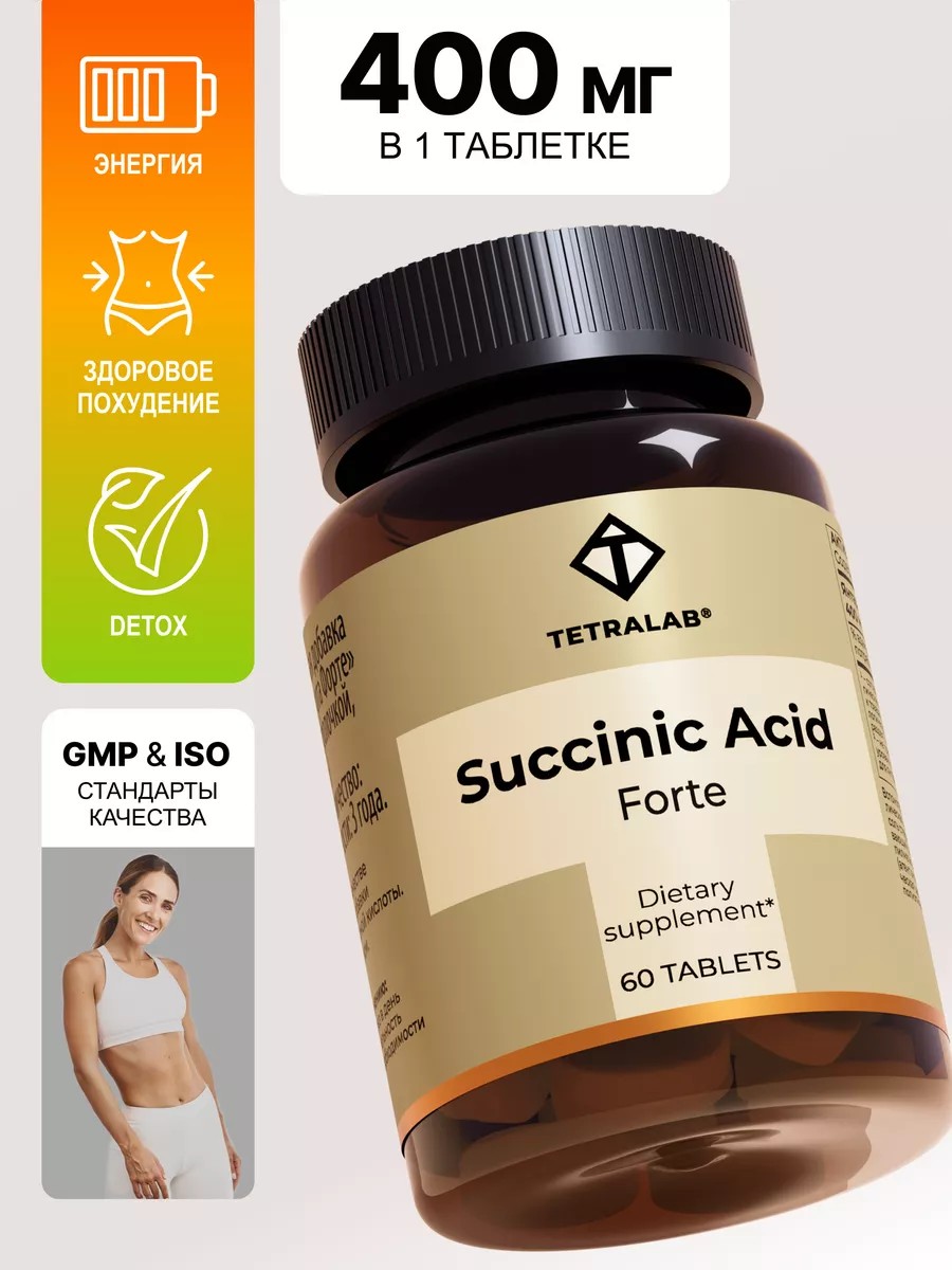 Succinic Acid Forte TETRALAB. Succinic acid promotes: maintaining performance, normalizing metabolic processes, and detoxifying the body. Succinic acid is present in all body cells, synthesized in the mitochondria, and promotes energy production. A healthy person requires sufficient amounts of this substance under normal conditions. However, intense physical activity, stress, and poor diet lead to a deficiency of this nutrient and deplete existing energy reserves. Therefore, to maintain an active lifestyle, it is necessary to maintain normal levels of this important bioactive component. In particular, a sufficient amount of succinic acid in the body helps reduce the effects of alcohol poisoning and helps with hangovers, as its activity neutralizes the toxic substance acetaldehyde. Succinic acid helps normalize metabolic processes and maintain performance. Succinic acid is an organic substance produced in almost all cells. During its chemical transformations, molecules of the main energy substrate, adenosine triphosphate (ATP), are formed. Thus, the nutrient participates in energy production processes in cells, which, in turn, leads to the activation of tissue respiration and improved transport of substances. Therefore, this bioelement is essential for the functioning of the entire body – it maintains performance, stimulates recovery after heavy physical and mental stress, and activates the immune system. Amber acid promotes detoxification of the body. Thanks to its action, succinic acid not only facilitates the absorption of nutrients but also exhibits a detoxifying effect. In particular, it neutralizes ethyl alcohol and the toxic products of its metabolism, thereby helping to alleviate hangover symptoms. Vitamins and dietary supplements \ energy \ detox \ for athletes \ antioxidant \ hangover \ succinic acid dietary supplement