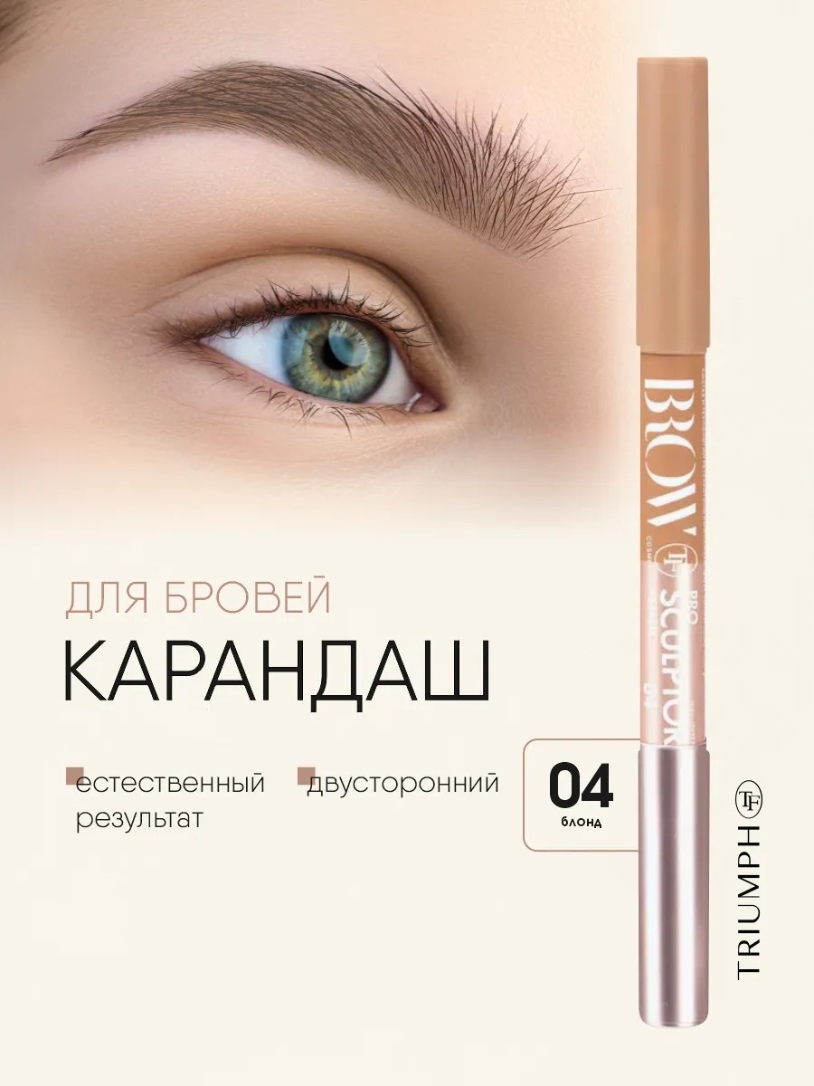 Brow Pro Sculptor Pencil from the decorative cosmetics brand Triumph is durable, does not smudge, does not form lumps, and does not irritate the skin. The pencil is sharpened with a cosmetic sharpener.