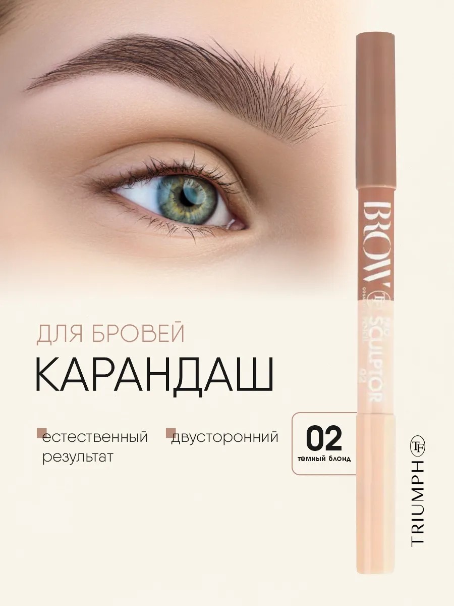 Brow Pro Sculptor Pencil from the decorative cosmetics brand Triumph is durable, does not smudge, does not form lumps, and does not irritate the skin. The pencil is sharpened with a cosmetic sharpener.