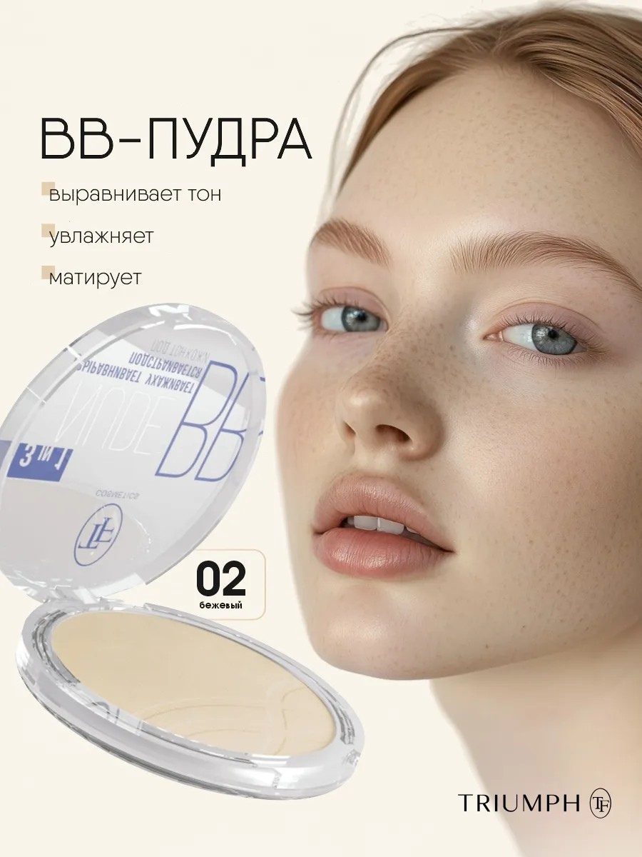 TF Cosmetics BB Nude Powder 3-in-1 #02 Beige. This versatile product from the Triumph makeup brand combines the properties of a compact powder and BB cream, making it ideal for express makeup looks. TF compact powder eliminates shine, mattifies, and leaves skin velvety smooth. BB powder evens out skin tone, conceals imperfections, and moisturizes and refreshes. This mattifying powder can be used as a setting powder to set makeup, as a standalone concealer, or to add a subtle finishing effect after foundation. The powder's soft, Photoshop-like texture conceals imperfections, evens out skin tone, and maintains a long-lasting fresh look without accentuating flaking, tightening skin, or clogging pores.
