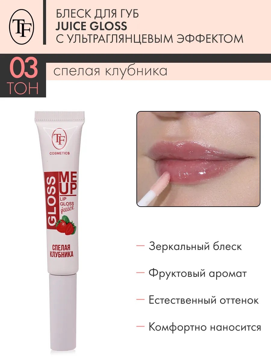 TF COSMETICS lip gloss in shade 03 STRAWBERRY will give your lips an ultra-glossy finish and a sensuous shine. Its gel texture ensures comfortable application and even distribution, leaving lips soft and hydrated. Thanks to its lightweight formula, the gloss is non-sticky and feels effortless on the lips. STRAWBERRY is a versatile shade that perfectly complements any look, whether daytime or evening.