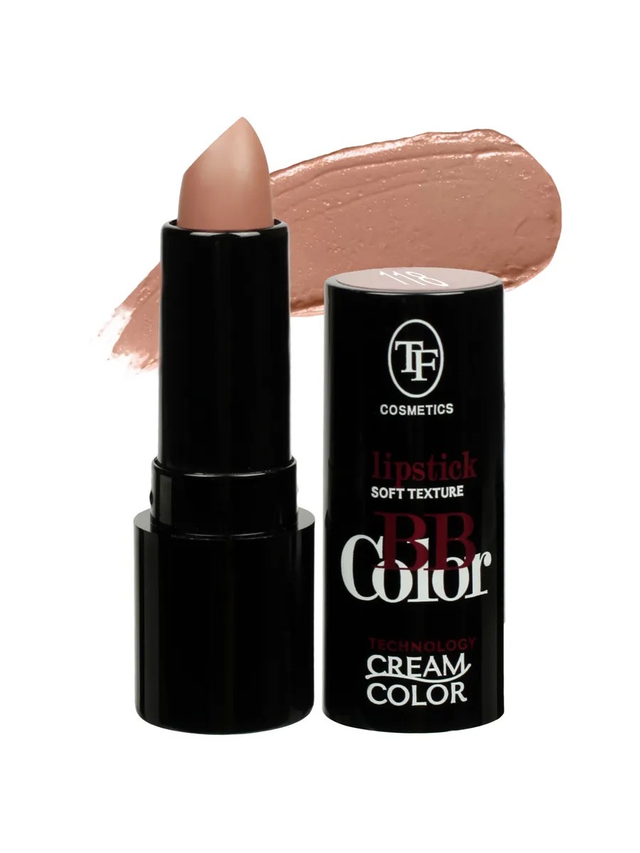TF cosmetics Помада для губ ВВ Color Lipstick, тон 118 бежевый. Губная помада с легким сатиновым финишем и увлажняющими свойствами — идеальный выбор для добавления яркого акцента в повседневный образ. Технология CreamColor позволяет наносить помаду в один ровный и насыщенный слой, обеспечивая питание и увлажнение кожи губ.