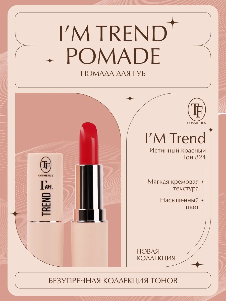 Губная помада TF Cosmetics линейки I'm TREND CZ22-824 Истинный красный станет идеальным дополнением к косметичке каждой девушки и женщины, стремящейся подчеркнуть свою красоту. Эта стойкая глянцевая помада сочетает в себе чистый насыщенный цвет и мягкую кремовую текстуру. Она равномерно распределяется по губам, обеспечивая комфортное нанесение и благородный глянцевый финиш.