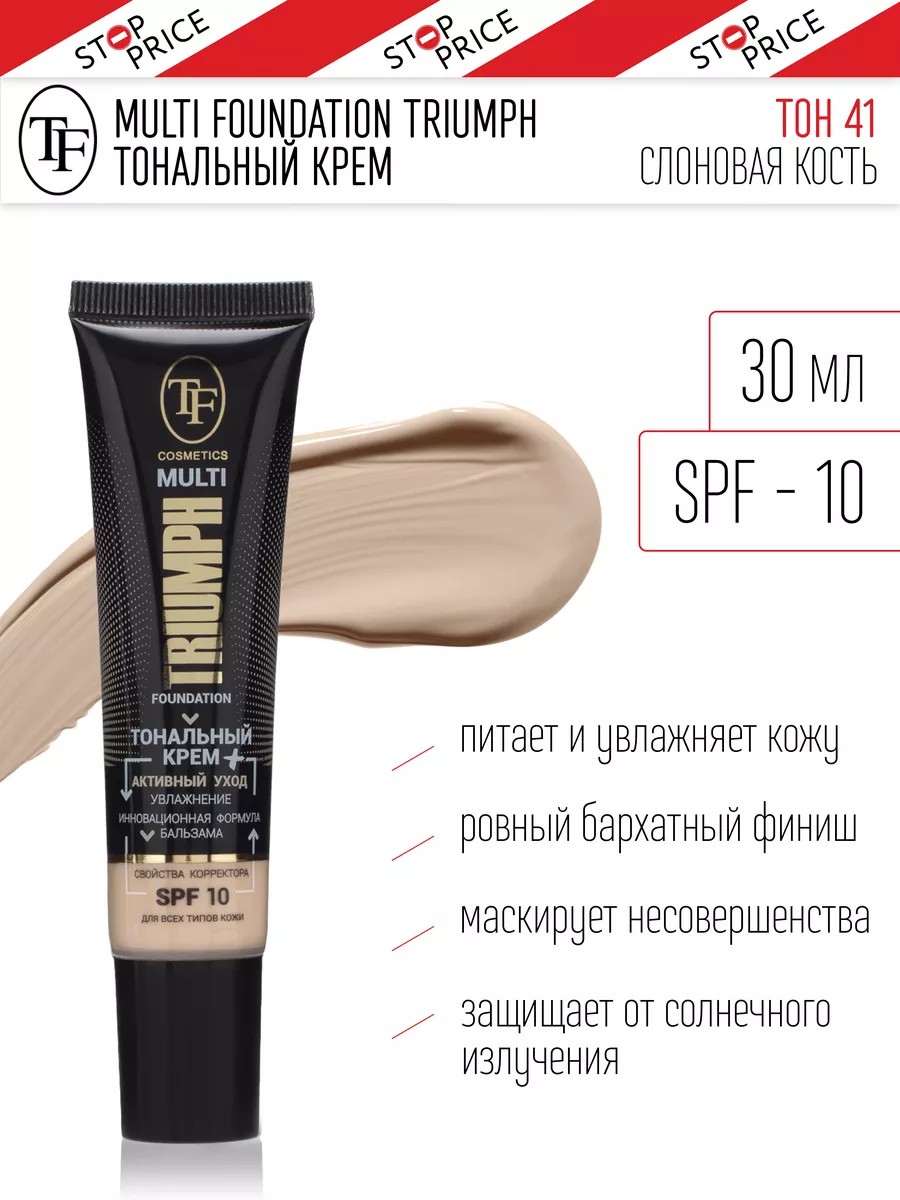 Тон 41 — слоновая кость. Тональный крем Multi Foundation Triumph — это сразу 3 средства в одном флаконе: тональный крем с матовым, идеально ровным финишем, бальзам-уход с интенсивным увлажнением и корректор, скрывающий цветовые несовершенства. Текстура бальзама дарит ощущение комфорта, питает и увлажняет кожу. Высокотехнологичные пигменты перекрывают цветовые неровности кожи, создавая ровный бархатно-матовый финиш. Крем средней плотности покрытия отлично справляется с маскировкой мелких несовершенств, покраснениями и пигментацией, выравнивая рельеф и тон кожи. Тональный крем с матовым финишом. SPF 10 защитит от вредного воздействия ультрафиолетовых лучей. Эти лучи являются основной причиной старения кожи и появления пигментных пятен. Регулярное применение тонирующего крема с SPF помогает предотвратить эти негативные последствия и сохранить кожу молодой и здоровой. Уход, увлажнение, коррекция, матовость.