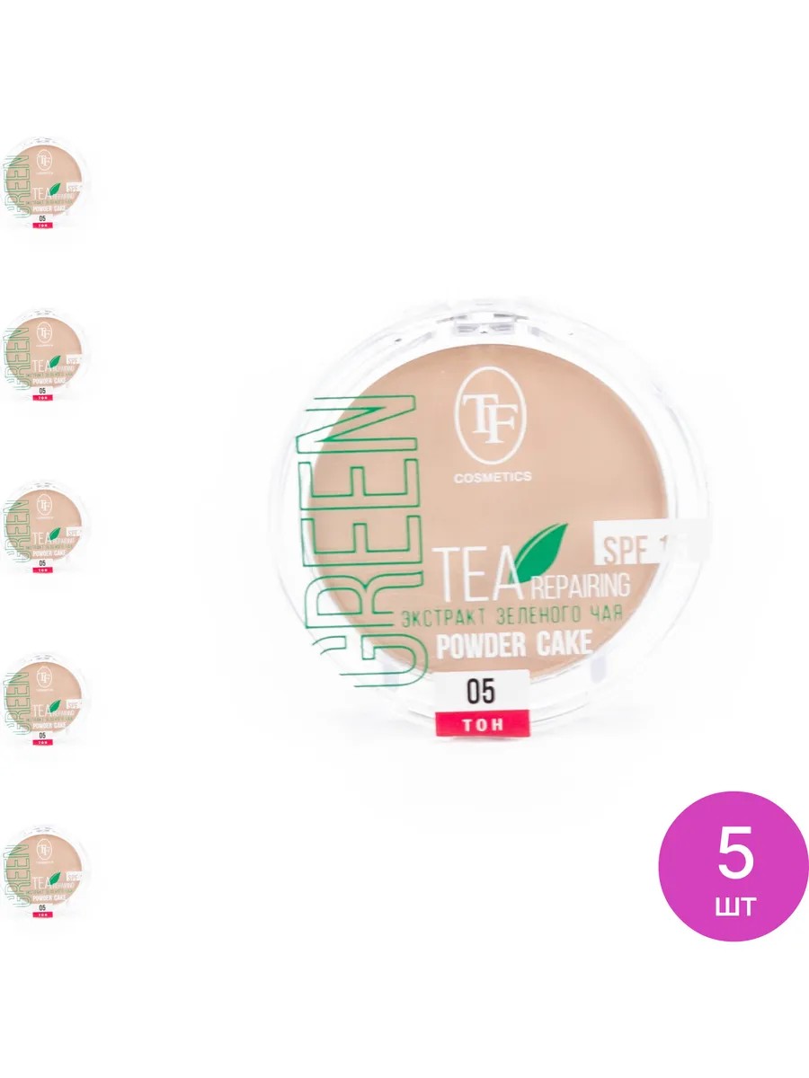 TF cosmetics / TF Cosmetics Mattifying face powder Green Tea Repairing Powder Cake shade 05 Natural beige, with green tea extract, SPF 15, 12g / decorative cosmetics. The set consists of 5 pcs. Price per set. Mattifying face powder TF cosmetics Green Tea Repairing Power Cake combines the coverage and durability of foundation with the velvety matte finish of powder. A new generation powder mattifies and evens out skin tone, conceals fine wrinkles and redness. Green tea extract has antioxidant properties. Light powder gently covers the skin, makes imperfections less noticeable, without creating a mask effect, does not weigh down the skin, does not clog pores. - Compact face powder with green tea extract combines the effective properties of skin care and decorative cosmetics. - Has mattifying properties, eliminating oily shine for a long time, evens out skin tone, giving it velvety softness and silkiness. . - Green tea extract increases skin firmness and elasticity, reduces puffiness, thanks to improved blood microcirculation and antioxidant properties. . - Green tea extract helps moisturize the skin, enhances its protective functions. . - The powder is recommended for normal and combination skin. . - Has SPF 15 sun protection and antibacterial properties. . How to use: For a more weightless coverage, apply powder with a fluffy brush. For a denser application, use a sponge or powder puff. TF cosmetics Green Tea Repairing Power Cake powder is the perfect finishing touch to any makeup! Transparent powder / loose powder / decorative cosmetics Face powder contains: TALC, MICA, MAGNESIUM STEARATE, ETHYLHEXYL PALMITATE, MINERAL OIL, DIMETHICONE, METHYLPARABEN, PROPYLPARABEN, BHT. May contain CI 15850, CI 19140, CI 45410, CI 77007, CI 77266, CI 77491, CI 77492, CI 77499, CI 77742, CI 77893.