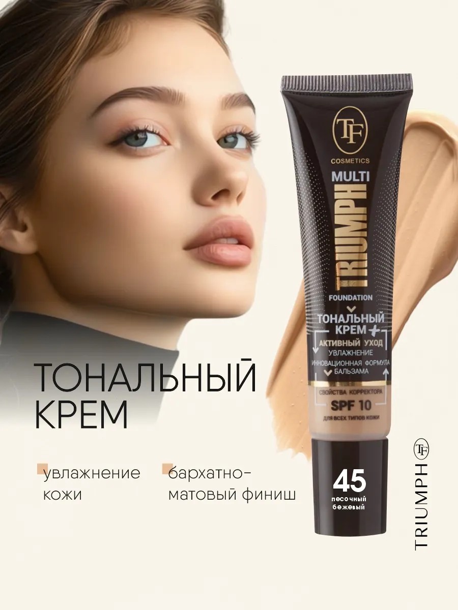 TF cosmetics Тональный крем Multi Foundation, тон 45 sand beige/песочный беж. Тональное косметическое средство декоративной косметики триумф объединяет в себе три функции: тональный крем с матовым финишем, бальзам-уход с интенсивным увлажнением и корректор, скрывающий цветовые несовершенства кожи. Этот крем станет незаменимым помощником в создании безупречного макияжа и уходе за кожей.