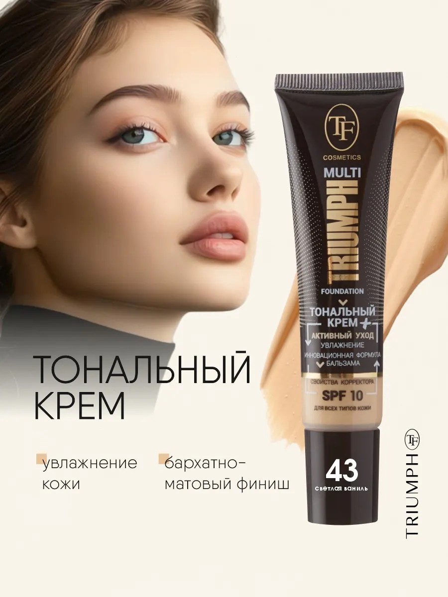 TF cosmetics Тональный крем Multi Foundation, тон 43 light vanilla/светлая ваниль. Тональное косметическое средство декоративной косметики триумф объединяет в себе три функции: тональный крем с матовым финишем, бальзам-уход с интенсивным увлажнением и корректор, скрывающий цветовые несовершенства кожи. Этот крем станет незаменимым помощником в создании безупречного макияжа и уходе за кожей.