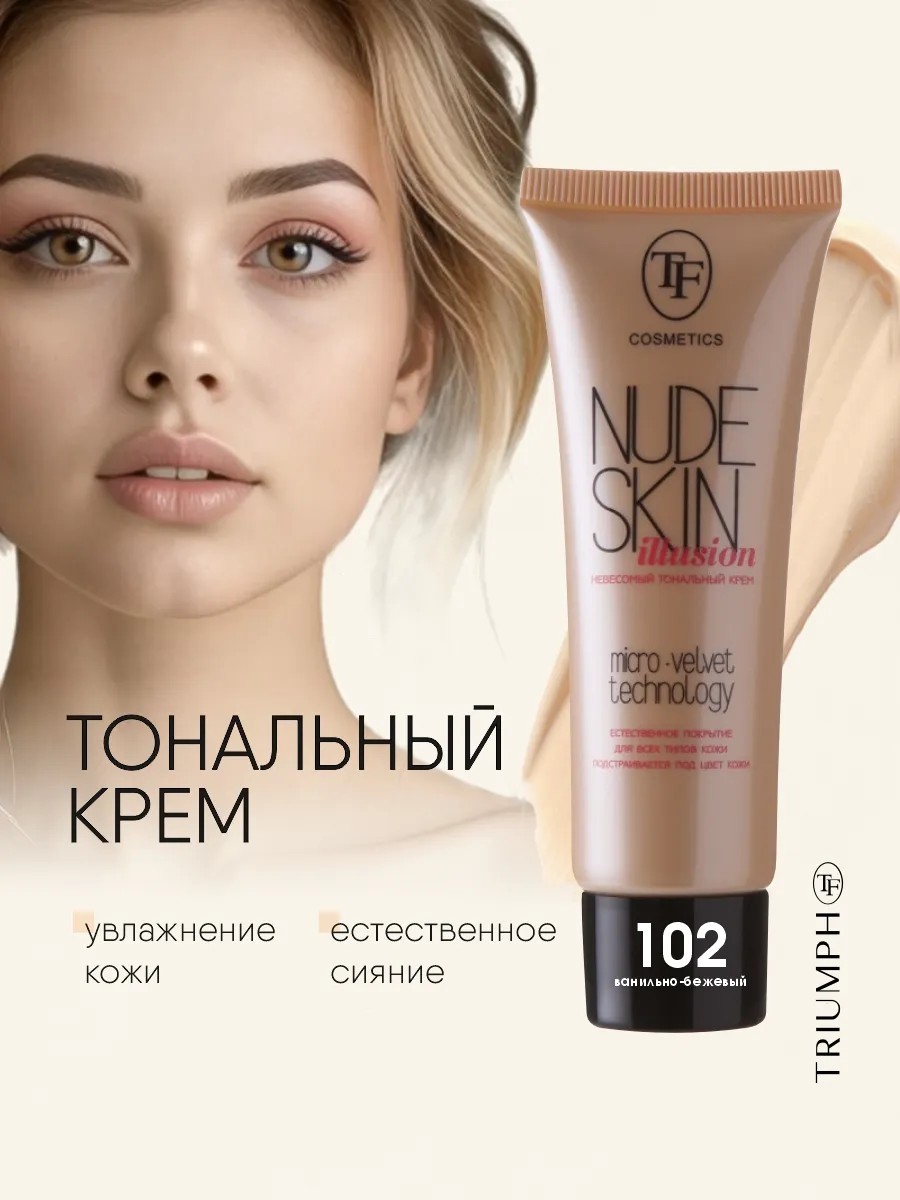TF cosmetics Тональный крем Nude Skin. Невесомый тональный крем с эффектом обнаженной кожи. NUDE SKIN ILLUSION - это легкая, тающая на коже тональная основа. Крем корректор придает коже изысканное бархатистое покрытие, обеспечивает оптимальную степень коррекции, не перегружает кожу. Легкая формула тональника дарит ощущение «второй кожи», перекрывая недостатки и оставляя безупречный матово-сатиновый финиш. Тональное средство для макияжа создает естественное сияние без жирного блеска за счет micro-velvet технологии. В составе матирующего крема использованы особые пигменты, позволяющие подобрать средство под любой оттенок кожи лица, обеспечивают еще более естественный результат при любом освещении. Тональник подходит для всех типов кожи, не подчёркивает шелушения и текстуру, надолго защищая лицо от жирного блеска (матирующий эффект). Не сушит и не стягивает кожу. Благодаря легкой текстуре тоналка идеально подходит для возрастной кожи. Подходит для повседневного и профессионального макияжа.