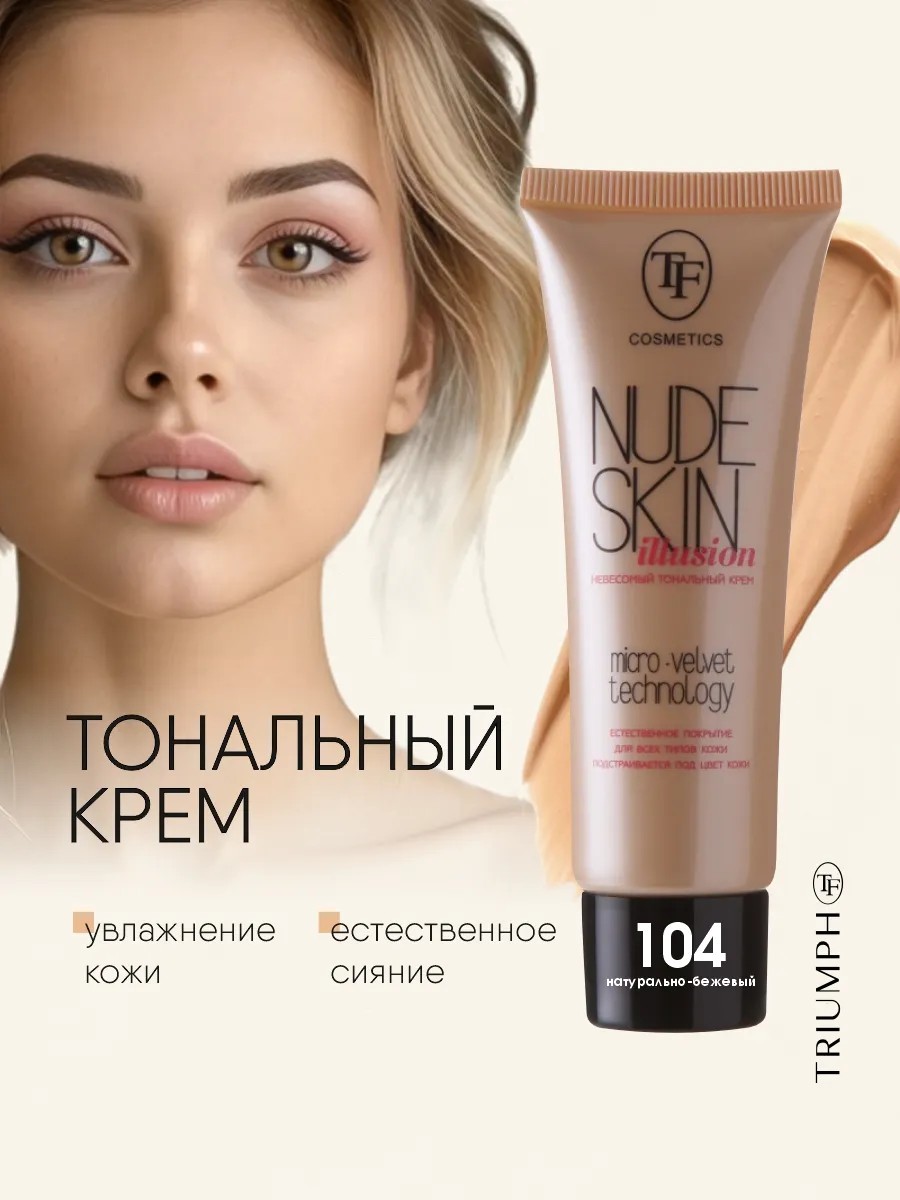 TF cosmetics Тональный крем Nude Skin. Невесомый тональный крем с эффектом обнаженной кожи. NUDE SKIN ILLUSION - это легкая, тающая на коже тональная основа. Крем корректор придает коже изысканное бархатистое покрытие, обеспечивает оптимальную степень коррекции, не перегружает кожу. Легкая формула тональника дарит ощущение «второй кожи», перекрывая недостатки и оставляя безупречный матово-сатиновый финиш. Тональное средство для макияжа создает естественное сияние без жирного блеска за счет micro-velvet технологии. В составе матирующего крема использованы особые пигменты, позволяющие подобрать средство под любой оттенок кожи лица, обеспечивают еще более естественный результат при любом освещении. Тональник подходит для всех типов кожи, не подчёркивает шелушения и текстуру, надолго защищая лицо от жирного блеска (матирующий эффект). Не сушит и не стягивает кожу. Благодаря легкой текстуре тоналка идеально подходит для возрастной кожи. Подходит для повседневного и профессионального макияжа.