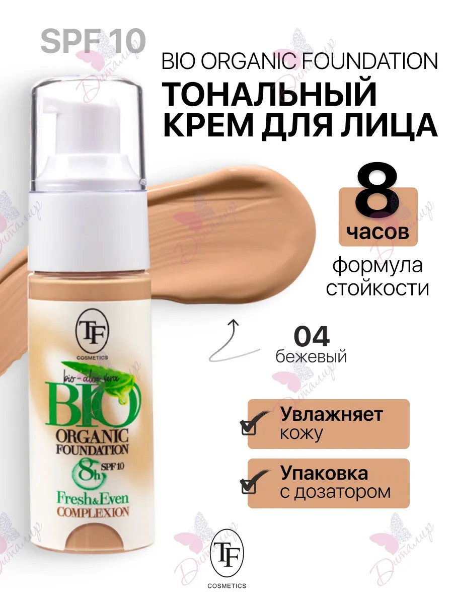 BIO ORGANIC FOUNDATION face foundation is the ideal solution for those seeking a flawless, radiant complexion. Its phyto-formula, enriched with thyme and chamomile extracts, not only evens out skin tone but also actively conditions the skin, providing deep hydration and nourishment. Aloe vera in the cream helps improve elasticity and regenerate the skin, while light-diffusing pigments give it a youthful, fresh appearance. Convenient packaging with a dispenser ensures economical use and protection from bacteria, while SPF-10 provides additional sun protection. Treat yourself to the luxury of well-groomed skin with BIO ORGANIC FOUNDATION! BIO ORGANIC FOUNDATION is the ideal cream for dry skin, combining the functions of a moisturizer and sunscreen. This unique product provides reliable protection from the harmful effects of the sun with SPF-10, making it an indispensable part of your daily skincare routine. This foundation, enriched with natural extracts, not only evens out skin tone but also actively conditions the skin, giving it a healthy, radiant appearance. This matte foundation with micronized powder particles effectively mattifies the skin, retaining moisture and preventing shine throughout the day. Thyme and chamomile extracts in the cream have a soothing and nourishing effect, improving the texture and color of the skin. Aloe vera helps improve elasticity and regeneration, leaving the skin firmer and more youthful. Convenient packaging with a dispenser ensures economical use and protects the cream from bacteria, which is especially important for maintaining the hygiene of the product. BIO ORGANIC FOUNDATION is more than just a foundation; it's a complete care product that gives your skin comfort and confidence all day long. Treat yourself to the luxury of well-groomed and protected skin with this unique cream, which will become an indispensable assistant in your makeup bag.