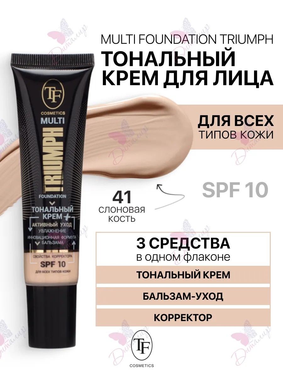 Тональный крем MULTI FOUNDATION TRIUMPH — это идеальное решение для создания безупречного макияжа и заботы о коже одновременно. В одном флаконе вы найдете три средства: тональную основу с матовым финишем, увлажняющий бальзам и корректор, который эффективно скрывает несовершенства. Его легкая текстура дарит ощущение комфорта, питая и увлажняя кожу, а высокотехнологичные пигменты обеспечивают ровный и бархатный тон, маскируя покраснения и пигментацию. С защитой SPF 10 вы можете быть уверены, что ваша кожа защищена от солнечного излучения в условиях города. Выберите тон 41 "слоновая кость" и наслаждайтесь идеальным макияжем, который не только скрывает недостатки, но и ухаживает за вашей кожей! Этот плотный тональный крем идеально подстраивается под ваш натуральный тон кожи, обеспечивая эффект выравнивания и матирования. Он станет отличной основой для дневного крема для лица, особенно для комбинированной и жирной кожи, помогая скрыть пигментные пятна и проблемные зоны. Благодаря своей способности тонировать и выравнивать, он создает светлый и естественный nude look, который подходит для молодого лица. Защитный фактор SPF 10 обеспечивает дополнительную защиту от солнца, делая его идеальным выбором для ежедневного нанесения. Тональный крем MULTI FOUNDATION TRIUMPH — это не просто крем для сухой кожи лица, а настоящий матирующий крем для лица, который также подходит для очень сухой кожи благодаря своей увлажняющей формуле. Этот тональный крем предлагает уникальное сочетание ухода и макияжа, превращая его в идеальный выбор для тех, кто ищет матовый тональный крем. Он также известен как крем от пигментных пятен на лице, обеспечивая безупречное покрытие и выравнивание тона кожи. Если вы ищете тональный крем для лица матирующий или тональный крем белый, MULTI FOUNDATION TRIUMPH станет вашим незаменимым помощником. Этот тональный крем создан для тех, кто ценит качество и эффективность в каждом нанесении.