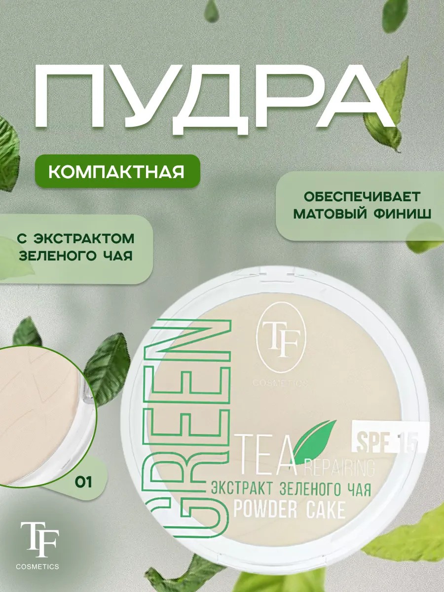 Compact face powder with green tea extract combines the effective properties of care and decorative cosmetics.