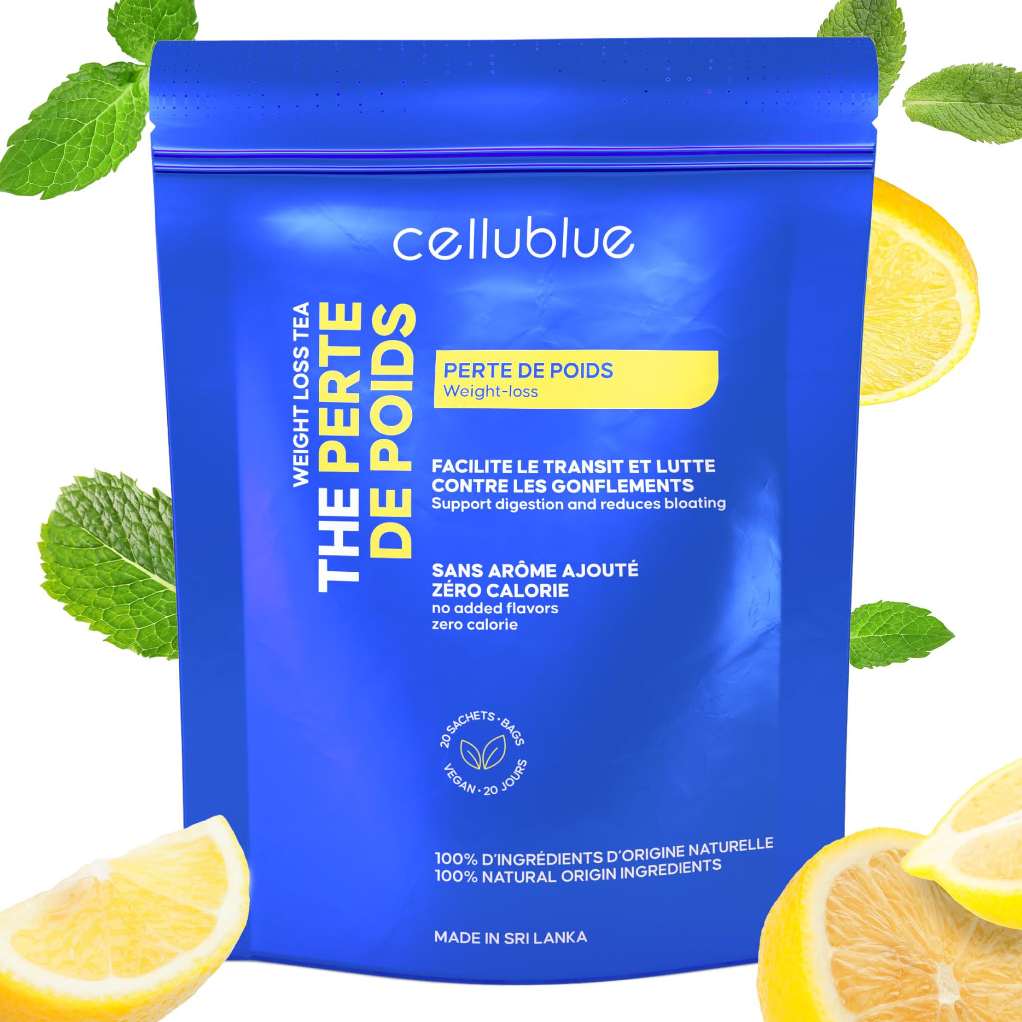 : Discover Cellublue Weight Loss Tea, the natural infusion that combines pleasure and effectiveness to help you reach your slimming goals. Thanks to a synergy of selected ingredients, this tea stimulates your metabolism and encourages fat burning, while providing a comforting moment of relaxation. Drawing on Cellublue's 12 years of expertise, it's part of a comprehensive approach: you'll enjoy a product that's both delicious and easy to incorporate into your daily routine, designed to sustainably support your weight loss goals. Each sachet contains a harmonious blend of plants and citrus fruits that target your curves while promoting detox and a feeling of lightness. You can enjoy it hot or cold, morning or afternoon: its delicate taste adapts to all your habits. The result: a gentle slimming boost, without frustration or extreme restrictions. Cellublue places naturalness and quality at the heart of its approach. The absence of unwanted additives and meticulous attention to detail guarantee a reliable product that respects your well-being. This Weight Loss Tea is for anyone seeking support in their slimming routine: it encourages toxin elimination and helps limit fat storage. To amplify its effects, combine it with a balanced diet and, if possible, a few minutes of physical activity each day. Make Weight Loss Tea your slimming ally: in addition to accelerating your results, it offers a pleasant, pampering ritual. Easy to prepare, it's the ideal solution for achieving a flatter stomach and overall digestive comfort. Choose this unique blend that combines expertise, natural ingredients, and pleasure, and move confidently towards the figure of your dreams. Ingredients: Ceylon black tea, peppermint, couch grass, meadowsweet, linden, green anise, orange, lemon, grapefruit, hibiscus flower. P.when('A').execute(function(A) { A.on('a:expander:toggle_description:toggle:collapse', function(data) { window.scroll(0, data.expander. expander[0].offsetTop-100) }) }) Safety Warning: Not recommended for pregnant or breastfeeding women. If in doubt, consult your doctor. See more? SLIMMER FIGURE. This infusion helps reduce bloating and slim the waist. It can aid digestion and limit fat storage. You'll notice gradual progress, supported by a balanced lifestyle. ? FRENCH BRAND, 12 YEARS OF EXPERTISE. Cellublue offers targeted solutions for the female figure. Its expertise guarantees a sophisticated product at the forefront of the latest advancements. You benefit from solid and reliable experience. NATURAL AND ADDITIVE-FREE FORMULA. This blend prioritizes high-quality plants. Its infusion offers detoxifying benefits without resorting to controversial substances. You'll adopt a healthy approach to your slimming routine. NATURAL CITRUS FLAVOR. Its fruity taste makes it easy to consume regularly, effortlessly. It fits perfectly into your day for a moment of pleasure. The selected ingredients are 100 natural. BOOSTS METABOLISM. This tea combines herbs and citrus fruits known for their slimming properties. Each cup helps naturally boost your fat burning. You progress towards your goals with ease.Description du produit Découvrez le Thé Perte de Poids de Cellublue, l'infusion naturelle qui allie plaisir et efficacité pour vous aider à cibler vos objectifs minceur. Grâce à une synergie d'ingrédients sélectionnés, ce thé stimule votre métabolisme et encourage la combustion des graisses, tout en procurant un moment de détente réconfortant. Issu de l'expertise de 12 ans de la marque Cellublue, il s'inscrit dans une démarche complète : vous profitez d'un produit à la fois gourmand, simple à intégrer à votre quotidien et pensé pour soutenir durablement vos envies de perte de poids. Dans chaque sachet, vous retrouvez un mélange harmonieux de plantes et d'agrumes qui agissent de façon ciblée sur vos rondeurs tout en favorisant la détox et la sensation de légèreté. Vous pouvez le déguster chaud ou froid, matin ou après-midi : son goût délicat s'adapte à toutes vos habitudes. Résultat : un coup de pouce minceur tout en douceur, sans frustration ni contrainte extrême. Cellublue place la naturalité et la qualité au cœur de sa démarche. L'absence d'additifs indésirables et l'attention portée aux moindres détails vous garantissent un produit fiable et respectueux de votre bien-être. Ce Thé Perte de Poids s'adresse à toutes celles qui cherchent un accompagnement dans leur routine minceur : il encourage l'élimination des toxines et contribue à limiter le stockage des graisses. Pour amplifier ses effets, associez-le à une alimentation équilibrée et, si possible, à quelques minutes d'activité physique par jour. Faites du Thé Perte de Poids votre allié minceur : en plus d'accélérer vos résultats, il vous offre un rituel cocooning agréable. Facile à préparer, c'est la solution idéale pour retrouver un ventre plus plat et un confort digestif global. Optez pour ce mélange unique qui conjugue expertise, naturalité et plaisir, et avancez sereinement vers la silhouette de vos rêves. Ingrédients THÉ NOIR DE CEYLAN, MENTHE POIVRÉE, CHIENDENT, REINE DES PRÉS, TILLEUL, ANIS VERT, ORANGE, CITRON, PAMPLEMOUSSE, FLEUR D'HIBISCUS. P.when('A').execute(function(A) { A.on('a:expander:toggle_description:toggle:collapse', function(data) { window.scroll(0, data.expander. expander[0].offsetTop-100) }) }) Avertissement De Sûreté Déconseillé chez la femme enceinte ou allaitante. En cas de doute, demandez l'avis de votre médecin. Voir plus? SILHOUETTE PLUS AFFINÉE. Cette infusion contribue à diminuer les gonflements et à affiner la taille. Elle peut faciliter la digestion et limiter le stockage des graisses. Vous constatez une évolution progressive, soutenue par un mode de vie équilibré. ? MARQUE FRANÇAISE, EXPERTISE 12 ANS. Cellublue propose des solutions ciblées pour la silhouette féminine. Son savoir-faire garantit un produit abouti et à la pointe des dernières avancées. V