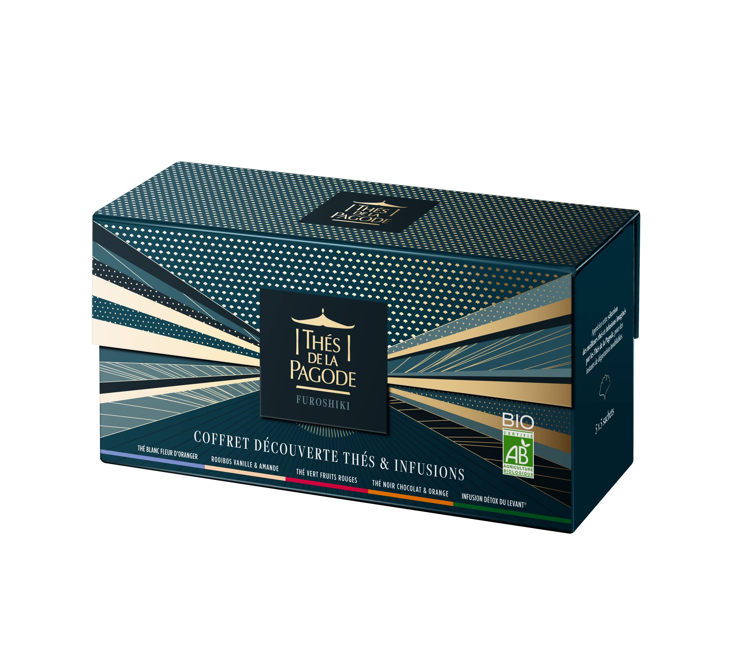 Pagoda Teas: "Furoshiki" Organic Christmas Tea Gift Set. With the Furoshiki organic Christmas tea gift set, enjoy excellent organic teas and a variety of flavors. This set contains 5 sachets of 5 different blends, for a total of 25 sachets: 1 organic red fruit green tea, 1 organic orange blossom white tea, 1 organic chocolate orange black tea, 1 organic vanilla almond rooibos, and 1 organic Levant Detox infusion. These varied teas are perfect for ending your holiday meals with a moment of serenity and escape. The black tea combines the richness of chocolate with the gentle bitterness of orange. The green tea blends bright and delicate flavors for a tasting experience that is both indulgent and refined. Finally, the vanilla almond rooibos and the Levant Detox infusion offer varied flavors, ideal at the end of a meal or for relaxing after the holiday season. This discovery set makes an ideal Christmas gift. Offer your loved ones a moment of warmth and comfort every day. Moreover, the precious hues of gold and deep blue in this limited edition, inspired by Furoshiki, the ancient Japanese art of gift wrapping, make it a sublime object to display in the kitchen. AB Certification: Thés de la Pagode's commitment to quality has led its experts to select teas from certified organic plantations. Discover the Furoshiki Collection: Our 2022 Christmas collection, dedicated to the refined art of Japanese Furoshiki, showcases the sumptuous effects of origami. Discover two other limited-edition products: the "Exquisite Cherry" Christmas tea and a tea advent calendar.DISCOVER THE FUROSHIKI COLLECTION: Our 2022 Christmas collection, dedicated to the refined art of Japanese Furoshiki, showcases the sumptuous effects of origami. Discover two other Limited Edition products: the "Exquisite Cherry" Christmas tea and a tea advent calendar. ORGANIC CERTIFICATION: The Pagoda Teas' commitment to quality has led their experts to select teas from certified organic plantations. A UNIQUE CHRISTMAS TEA GIFT SET: This discovery set makes an ideal Christmas gift. Offer your loved ones a moment of warmth and comfort every day. Furthermore, the precious hues of gold and deep blue in this limited edition, inspired by Furoshiki, an ancient Japanese art of gift wrapping, make it a sublime object to display in the kitchen. A RANGE OF FLAVORS: These varied teas are perfect for ending your holiday meals with a moment of serenity and escape. The black tea combines the indulgence of chocolate with the gentle bitterness of orange. The green tea blends bright and delicate flavors for a tasting experience that is both indulgent and refined. Finally, the vanilla almond rooibos and the Levant Detox infusion offer a variety of flavors, ideal at the end of a meal or for relaxing after the holiday season. A DISCOVERY SET FOR CHRISTMAS: With the Furoshiki organic Christmas tea set, savor excellent organic teas and explore a variety of flavors. This set contains 5 sachets of 5 different blends, for a total of 25 sachets: 1 organic red fruit green tea, 1 organic orange blossom white tea, 1 organic chocolate orange black tea, 1 organic vanilla almond rooibos, and 1 organic Levant Detox infusion.Thés de la Pagode : Coffret de thés de Noël bio "Furokishi" Avec le coffret de thés de Noël bio Furoshiki, savourez d'excellents thés bio et variez les saveurs. Ce coffret contient 5 sachets de 5 recettes différentes, soit 25 sachets en tout : 1 thé vert fruits rouges bio, 1 thé blanc fleur d'oranger bio, 1 thé noir chocolat orange bio, 1 rooibos vanille amande bio, et 1 infusion Détox du levant bio. Ces thés variés sont parfaits pour clore vos repas de fêtes sur un moment de sérénité et d'évasion. Le thé noir associe gourmandise du chocolat et douce amertume de l'orange. Le thé vert mélange saveurs vives et délicates, pour une dégustation à la fois gourmande et raffinée. Enfin, le rooibos vanille amande et l'infusion Détox du levant proposent des saveurs variées, idéales en fin de repas, ou pour se détendre après la période des fêtes. Ce coffret découverte constitue un cadeau de Noël idéal. Avec lui, offrez à vos proches un moment de chaleur et de réconfort quotidien. De plus, les teintes précieuses entre or et bleu profond de cette édition limitée, inspirée du Furoshiki, un art ancestral japonais d'offrir et d'empaqueter les cadeaux, en fait un objet sublime à exposer dans la cuisine. Certification AB : L'exigence de qualité des Thés de la Pagode a fait choisir à ses experts les thés issus de plantations certifiées Agriculture Biologique. Découvrez la collection Furoshiki : Notre collection Noël 2022, dédiée à l'art raffiné du Furoshiki nippon, met à l'honneur les effets somptueux d'origami. Découvrez 2 autres produits en Éditions Limitées, le thé de Noël "Cerise Exquise" et un calendrier de l'avent des thés.DÉCOUVREZ LA COLLECTION FUROSHIKI : Notre collection Noël 2022, dédiée à l'art raffiné du Furoshiki nippon, met à l'honneur les effets somptueux d'origami. Découvrez 2 autres produits en Édition Limitées, le thé de Noël "Cerise Exquise" et un calendrier de l'avent des thés. CERTIFICATION AB : L'exigence de qualité des Thés de la Pagode a fait choisir à ses experts les thés issus de plantations certifiées Agriculture Biologique. UN COFFRET DE THÉS DE NOËL UNIQUE : Ce coffret découverte constitue un cadeau de Noël idéal. Avec lui, offrez à vos proches un moment de chaleur et de réconfort quotidien. De plus, les teintes précieuses entre or et bleu profond de cette édition limitée, inspirée du Furoshiki, un art ancestral japonais d'offrir et d'empaqueter les cadeaux, en fait un objet sublime à exposer dans la cuisine. ÉVENTAIL DE SAVEURS : Ces thés variés sont parfaits pour clore vos repas de fêtes sur un moment de sérénité et d'évasion. Le thé noir associe gourmandise du chocolat et douce amertume de l'orange. Le thé vert mélange saveurs vives et d
