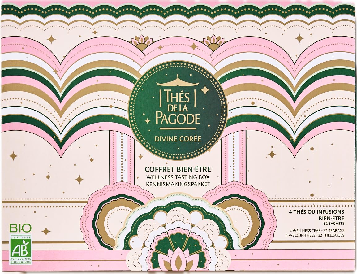 : Pagoda Teas: "Divine Korea" Organic Gourmet Tea Gift Set. Discover our wellness gift set, an invitation to serenity and self-care with a refined selection of 4 teas and infusions, each chosen for its health and well-being benefits. This set contains 8 sachets of 4 different blends, for a total of 32 sachets. These varied, 100 organic teas are perfect for pampering yourself and ending your holiday meals with a moment of serenity. Your guests can choose from Relaxaé tea, an organic anti-stress green tea with hemp, lemon balm, and chamomile Equilibre du Lotus infusion, with sage for feminine balance Yinpur digestive detox green tea or Ydrao organic green tea, for healthy skin. This discovery set makes an ideal Christmas gift. Offer your loved ones a moment of warmth and daily comfort. The delicate, shimmering patterns of this gift set, inspired by Korean temples, make it a sublime object to display in your kitchen. Thés de la Pagode's commitment to quality has led its experts to select teas from certified organic plantations. Our Christmas 2024 collection, dedicated to the culture, history, and spirituality of the Land of the Morning Calm, celebrates the Buddhist temples of Korea, each vying with the others in their decorations and hidden treasures. Discover the other Limited Edition products in the collection: the Christmas ornament, the tea advent calendar, and the gourmet tea gift set. Ingredients: green teaDISCOVER THE DIVINE KOREA COLLECTION: Our Christmas 2024 collection, dedicated to the culture, history, and spirituality of the Land of the Morning Calm, celebrates the Buddhist temples of Korea, each vying with the others in their decorations and hidden treasures. Discover the other Limited Edition products in the collection: the Christmas ornament, the tea advent calendar, and the gourmet tea gift set. ORGANIC CERTIFICATION: The Pagoda Teas' commitment to quality has led its experts to select teas from certified organic plantations. A UNIQUE CHRISTMAS TEA GIFT SET: This discovery set makes an ideal Christmas gift. Offer your loved ones a moment of warmth and comfort every day. The delicate, shimmering patterns of this gift set, inspired by Korean temples, make it a sublime object to display in the kitchen. WELLNESS TEAS INFUSIONS: These varied, 100 organic teas are perfect for self-care and ending your holiday meals with a moment of serenity. Your guests can choose from Relaxaé tea, an organic green tea with hemp, lemon balm, and chamomile to combat stress Equilibre du Lotus infusion, with sage for feminine balance Yinpur digestive detox green tea or Ydrao organic green tea for healthy skin. A SERENITY GIFT SET FOR CHRISTMAS: Discover our wellness gift set, an invitation to serenity and self-care with a refined selection of 4 teas and infusions, each chosen for its health and well-being benefits. This set contains 8 sachets of 4 different blends, for a total of 32 sachets.Description du produit Thés de la Pagode : Coffret de thés Gourmets Bio "Divine Corée" Découvrez notre coffret bien-être, une invitation à la sérénité et au soin de soi avec une sélection raffinée de 4 thés et infusions, chacun choisi pour ses vertus santé et bien-être. Ce coffret contient 8 sachets de 4 recettes différentes, soit 32 sachets en tout. Ces thés variés, 100 Bio, sont parfaits pour prendre soin de soi et pour clore vos repas de fêtes sur un moment de sérénité. Vos convives pourront déguster, au choix, le thé Relaxaé, un thé vert bio anti-stress au chanvre, mélisse et camomille, l'infusion Equilibre du Lotus, à la sauge pour l'équilibre féminin, le thé vert détox digestif Yinpur, ou le thé vert bio Ydrao, pour une peau en bonne santé. Ce coffret découverte constitue un cadeau de Noël idéal. Avec lui, offrez à vos proches un moment de chaleur et de réconfort quotidien. Les motifs délicats aux couleurs chatoyantes de ce coffret, inspirés des temples coréens, en font un objet sublime à exposer en cuisine. L'exigence de qualité des Thés de la Pagode a fait choisir à ses experts les thés issus de plantations certifiées Agriculture Biologique. Notre collection Noël 2024, dédiée à la culture, à l'histoire et à la spiritualité du Pays du Matin Calme, met à l'honneur les temples bouddhistes de Corée, qui rivalisent en décors et en trésors plus ou moins cachés. Découvrez les autres produits en Édition Limitées de la collection, la boule de Noël, le calendrier de l'avent des thés et le coffret des thés gourmets. Ingrédients thé vertDÉCOUVREZ LA COLLECTION DIVINE CORÉE : Notre collection Noël 2024, dédiée à la culture, à l'histoire et à la spiritualité du Pays du Matin Calme, met à l'honneur les temples bouddhistes de Corée, qui rivalisent en décors et en trésors plus ou moins cachés. Découvrez les autres produits en Édition Limitées de la collection, la boule de Noël, le calendrier de l'avent des thés et le coffret des thés gourmets. CERTIFICATION AB : L'exigence de qualité des Thés de la Pagode a fait choisir à ses experts les thés issus de plantations certifiées Agriculture Biologique. UN COFFRET DE THÉS DE NOËL UNIQUE : Ce coffret découverte constitue un cadeau de Noël idéal. Avec lui, offrez à vos proches un moment de chaleur et de réconfort quotidien. Les motifs délicats aux couleurs chatoyantes de ce coffret, inspirés des temples coréens, en font un objet sublime à exposer en cuisine. THÉS INFUSIONS BIEN ETRE : Ces thés variés, 100 Bio, sont parfaits pour prendre soin de soi et pour clore vos repas de fêtes sur un moment de sérénité. Vos convives pourront déguster, au choix, le thé Relaxaé, un thé vert bio anti-stress au chanvre, mélisse et camomille, l'infusion Equilibre du Lotus, à la sauge pour l'équilibre féminin, le thé vert détox digestif Yinpur, ou le thé vert bio Ydrao, pour une peau en bonne santé. UN COFFRET SÉRÉNITÉ POUR NOËL : Découvrez notre coffret bien-être, une 